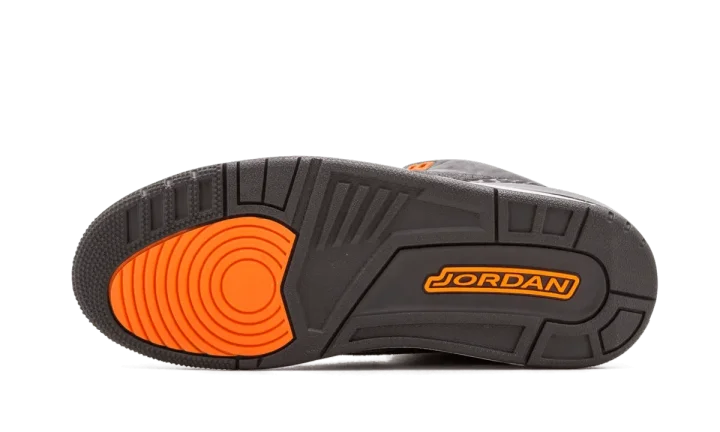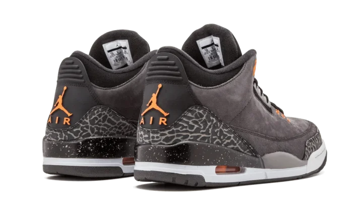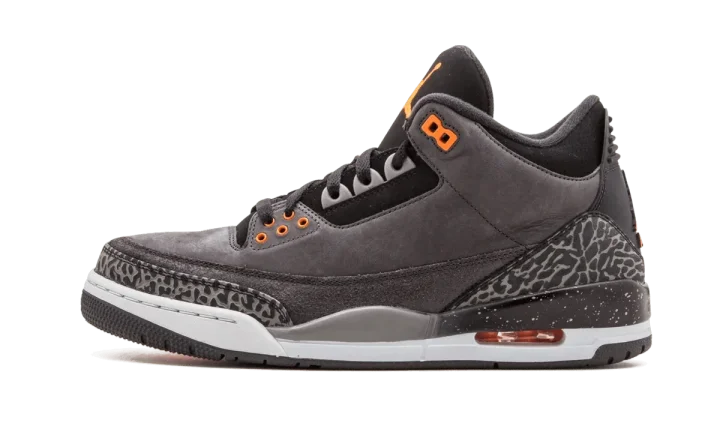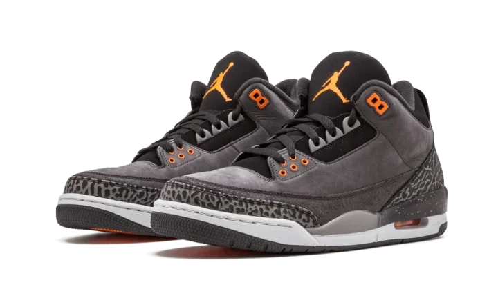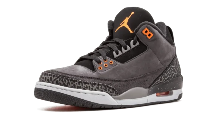 From the "Fear Pack" of 2013, this Air Jordan 3 features a dark grey and black leather upper with orange accents.