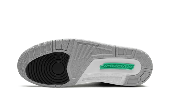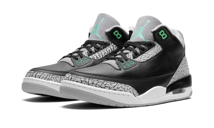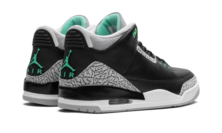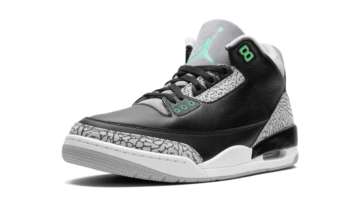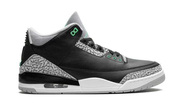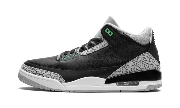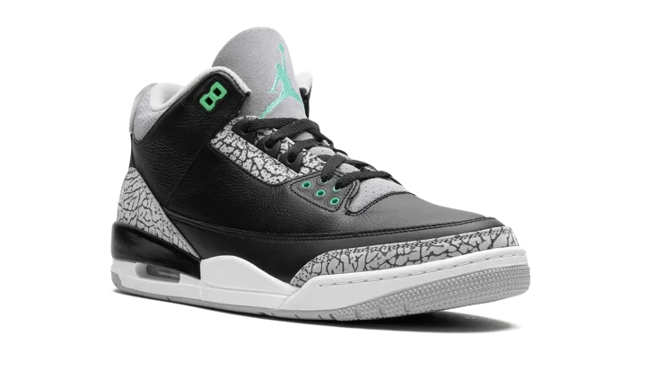 The Air Jordan 3 "Green Glow" is a colorway of Michael Jordan's third signature shoe loosely inspired by the Jordan 3's iconic "Black Cement" style, but with a twist. Like the Jordan 3 "Black Cement," the "Green Glow" features a black leather upper and grey elephant print details, but with light green accenting instead of the red accenting found on the "Black Cement." Specifically, Green Glow accenting appears on the eyelets, on the Jumpman branding on the tongue and heel, and on the "Jordan" logo on the outsole. A black painted mudguard appears on the heel above the white midsole. A small visible Air unit in the heel of the midsole gives the "Green Glow" a classic Jordan 3 look. Release date: March 16, 2024