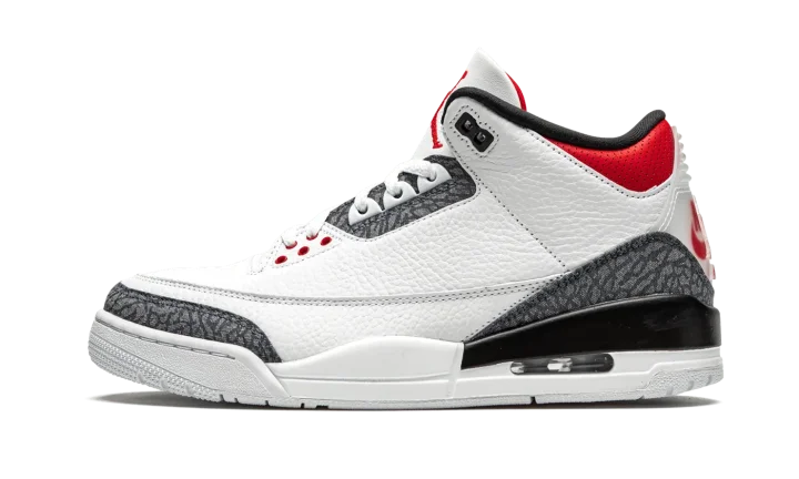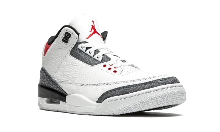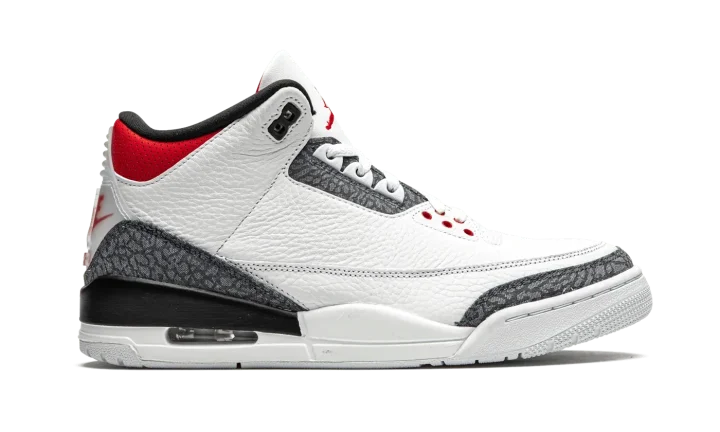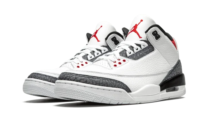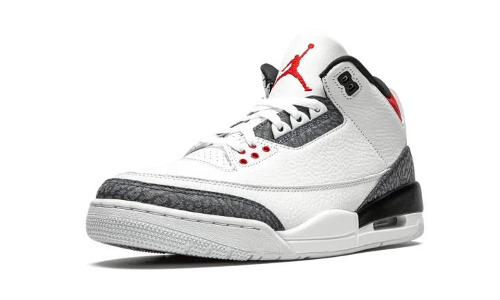 The Air Jordan 3 Denim "Fire Red" is an alternate colorway of Michael Jordan's third signature shoe that features denim-based accenting. Released in Summer 2020, the Jordan 3 Denim "Fire Red" displays a brand new appearance while retaining the model's core design details. White leather appears as the base of the upper. Contrasting elephant print finished in a durable denim material is located on the mudguard on the heel, toe cap, and upper eyelets. Fiery red hardware dots the lower eyelets and red dotted leather detailing appears on the collar. Additional details include a black liner, red embroidered Jumpman on the tongue, and translucent heel with dual Jumpman and "Nike Air" insignias. Release date: August 27, 2020.