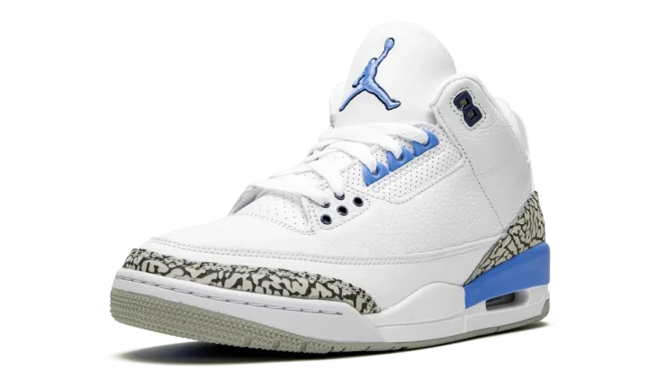 The Air Jordan 3 "UNC" is a Carolina-blue-based colorway of the Jordan 3 design inspired by the University of North Carolina Tarheels. The "UNC" makeup of the Air Jordan 3 first arrived as a player exclusive during the 2018 NCAA Men's March Madness Basketball Tournament and now re-appears as a separate release for the general public. Similar to the PE version, the retail Air Jordan 3 "UNC" features a white tumbled leather base that includes hits on the toe and mid-panel. Contrasting along the mudguard comes in the form of Air Jordan 3-specific elephant print on the toe, lateral panel, and heel that contrasts a solid white leather mudguard. Completing the look is black Jumpman branding on the heel and a light grey outsole. Release date: Spring 2020.