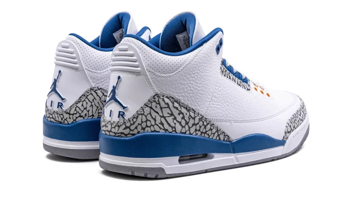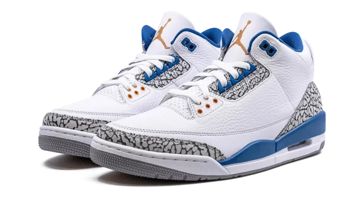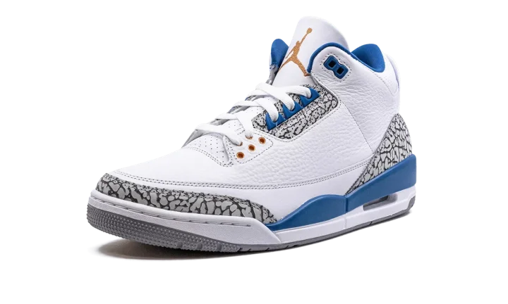 The Air Jordan 3 "Wizards" is the modern, retail version of the former Player Exclusive colorway of the Jordan 3 that was worn by Michael Jordan with the Washington Wizards. Originally an unreleased Player Exclusive sneaker worn by Jordan during his tenure with the Wizards in the early 2000s, the Jordan 3 "Wizards" was officially released by Jordan Brand in 2023 with much fanfare. The colorway's white, blue, and elephant print accents nod to the Air Jordan 3 "True Blue's" color scheme, and its gold accents salute to the Wizards' former team uniform colors. The shoe features a white leather construction with classic elephant print on the toe and heel. True Blue detailing comes into play on the eyelet panel and on the mudguard. "Nike Air" branding is found on the back of the shoe, and a gold Jumpman is embroidered on the tongue. Release date: April 29, 2023