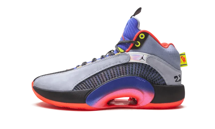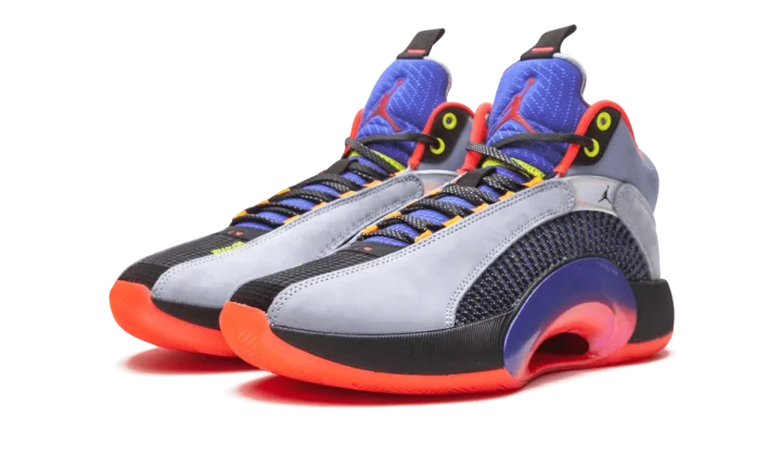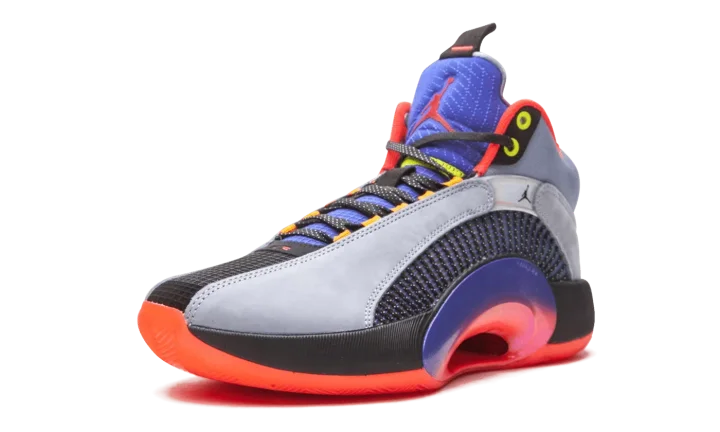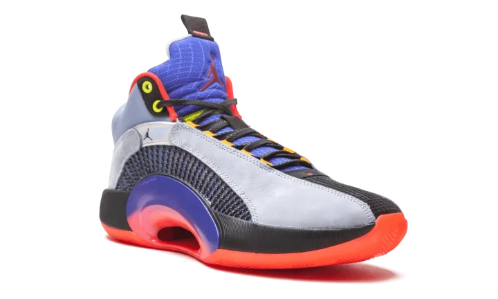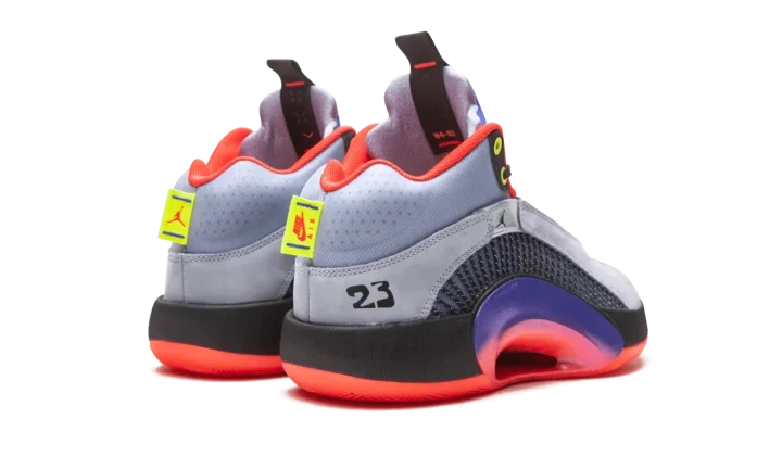 The Air Jordan 35 "Center of Gravity" is an October 2020 colorway of the performance basketball shoe that culls design cues from its Air Jordan heritage. Noticeably lighter in weight than its predecessor due to a modernized and updated Eclipse Plate, the Jordan 35 also features a new Flightwire system with an underlaid Kurim cage for improved on-court performance capabilities. Aesthetically, the "Center of Gravity" displays grey suede overlays above the multicolor, semi-translucent panels on either side. A small black Jumpman appears on the iridescent overlay on the collar and funky "23" detailing can be found on the lateral side in reference to the styling of the Player Exclusive Air Jordan 5 that Michael Jordan wore with the Chicago Bulls. The design of the collar, tongue, and heel is reminiscent of the original design of the Air Jordan 5, as well. On the heel, a yellow product tag features dual "Nike Air" and Jumpman detailing as a call out to the Jordan 35's Air Jordan heritage. The model's black Eclipse Plate extends to the midsole. Enclosed Zoom Air units in the forefoot and heel of the midsole provide a responsive ride. Release date: October 17, 2020.