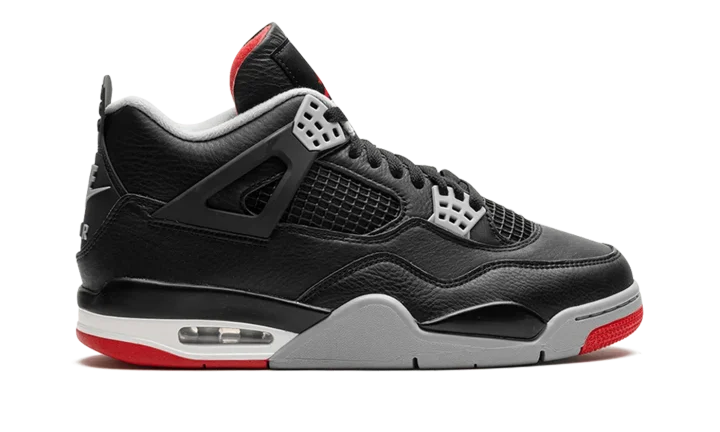 The Air Jordan 4 "Bred Reimagined" is an iconic and original colorway of the fourth Air Jordan sneaker that replicates the model's original design. The "Bred Reimagined" was released by Jordan Brand in February 2024 to celebrate the legendary Jordan 4's 35th anniversary. Dressed in the same color block as the original version from 1989, the "Bred Reimagined" mimics the look of the OG Jordan 4 "Bred" with accurate-to-original panels, colors, and overall shape. However, the design does differ from the original "Bred" Air Jordan 4 by featuring a tumbled leather upper instead of the OG's nubuck construction. Cement Grey plastic eyelets contrast the look on the front of the shoe. On the back, Cement Grey "Nike Air" branding gives the sneaker a classic look. A red Jumpman and "Flight" branding in cursive appear on the tongue tag. A grey and white rubber midsole completes the look. Release date: February 17, 2024