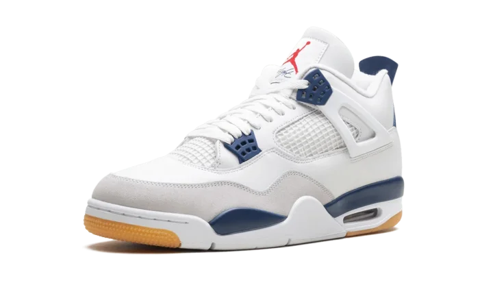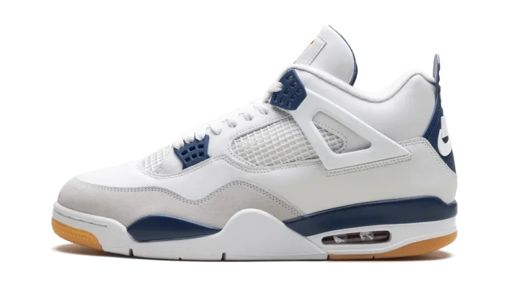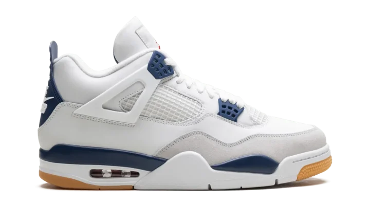 The Nike SB x Air Jordan 4 "Navy" is a new installment in the ongoing collaboration between Nike Skateboarding and Jordan Brand. The Nike SB AJ4 looks like a traditional Jordan 4 but has some unique details. Suede is placed around the toe box to make the shoe more skate-friendly. The clean navy and white upper is accented with a gum outsole, and Nike SB branding appears on the heel.