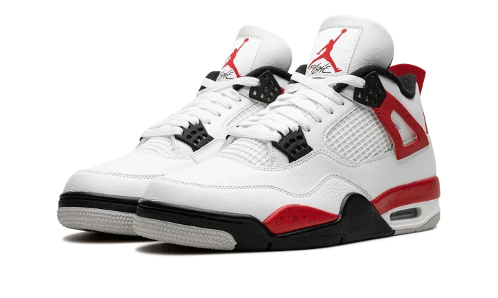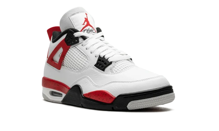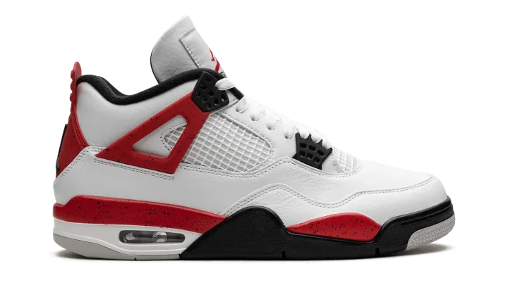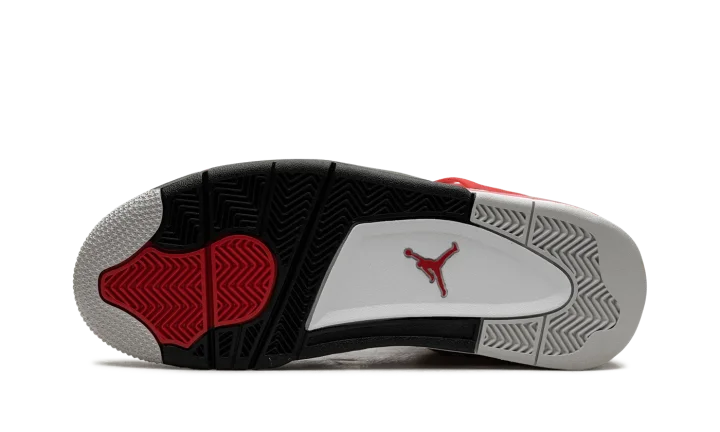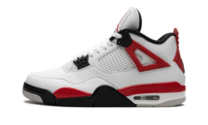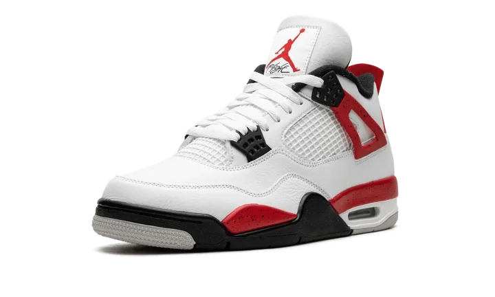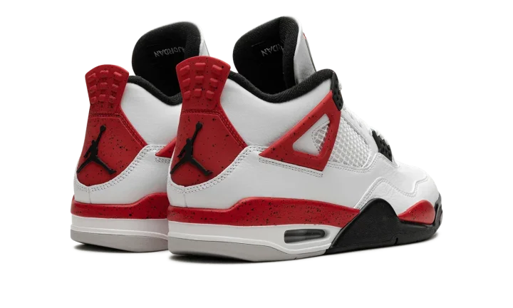 The Air Jordan 4 "Red Cement" is a colorway of the retro basketball shoe inspired by the Jordan 4's iconic "White Cement" style. The "Red Cement' Jordan 4 is designed similarly to the model's original "White Cement" colorway, but with a few key differences. The "Red Cement" features red-based cement detailing while the "White Cement" has grey cement patterning. As for the rest of the design, the "Red Cement" Jordan 4 has a white leather upper with tonal leather overlays and white netting on the tongue and mid-panel. The black plastic eyelets are contrasted by Fire Red-based "wings" with a speckle pattern. The fiery red speckled pattern also appears on the shoe's mudguard and heel counter. A black Jumpman can be found on the tongue and heel. Release date: September 9, 2023