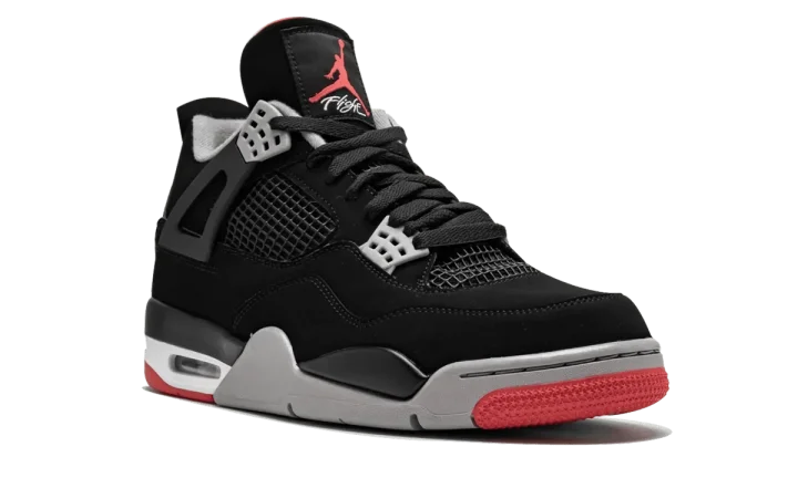 This Air Jordan 4 "Bred" is the 2019 retro of the iconic colorway of Michael Jordan's fourth signature shoe. The famous black and red version of the Jordan 4 returned in the spring of 2019 with its original "Nike Air" branding on the heel for the first time since its first retro release in 1999. Now 20 years after that first retro and 30 years after its initial 1989 release, the "Bred" Air Jordan 4 looks just as outstanding as ever. This true-to-OG retro features a black Durabuck (synthetic nubuck) upper with grey, red, and white accents throughout. In addition to the large Nike Air logo on the heel tab, the original Nike branding is also present on the outsole and sockliner. The Air Jordan 4 "Bred" released on May 4, 2019.