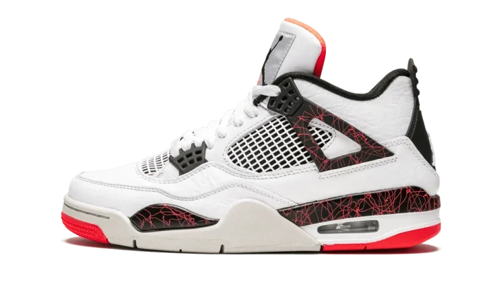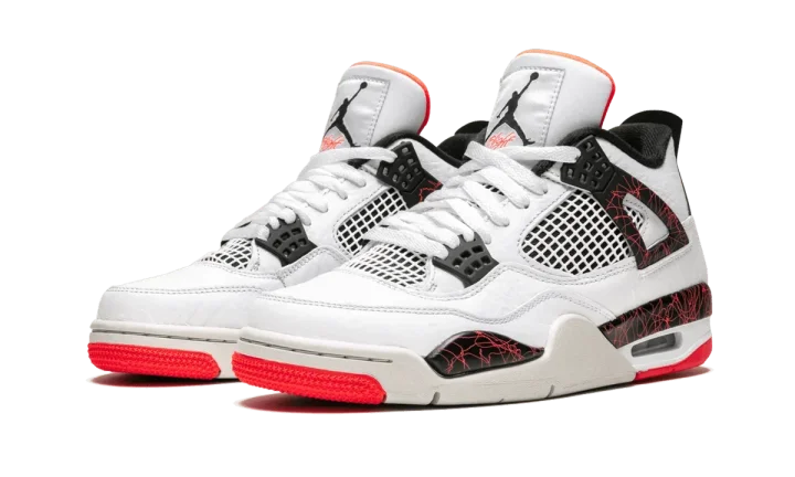 The Air Jordan 4 "Bright Crimson/Pale Citron" is a 2019 release of the iconic silhouette in a vibrant colorway. Inspired by the era when Michael Jordan's fourth signature shoe first released, the classic model features a late '80s aesthetic, constructed in white leather with black and Bright Crimson accents. A Bright Crimson paint splatter effect is added to the triangular "wings" on the upper as well as on the midsole for added flair. Light grey rubber on the midsole and outsole add a vintage look to colorway and help emphasize the throwback theme. The Air Jordan 4 "Bright Crimson/Pale Citron" released in March 2019.