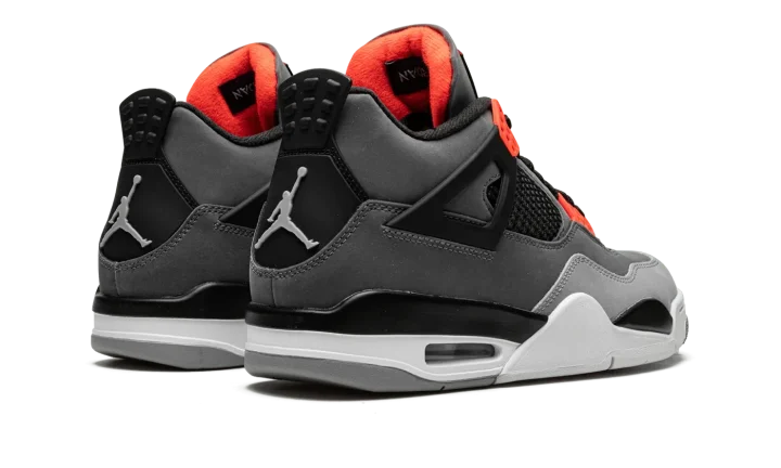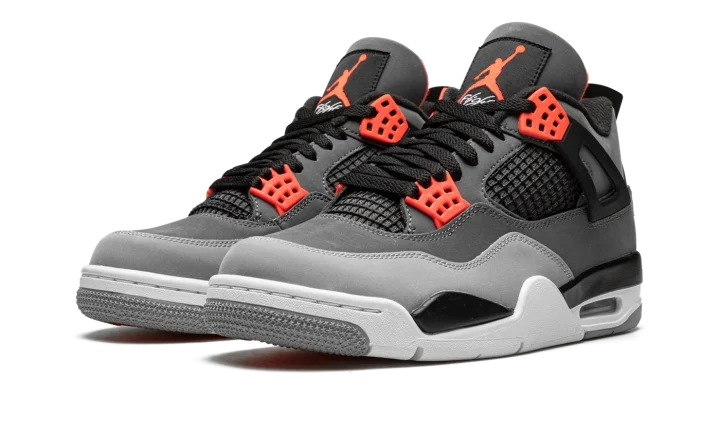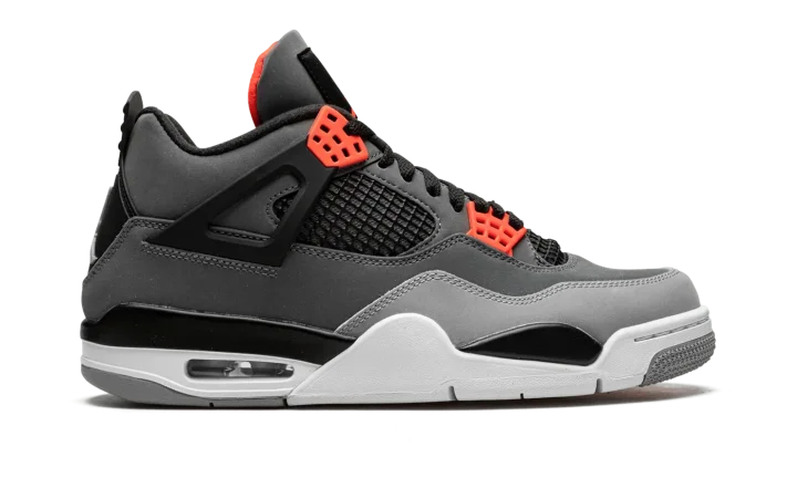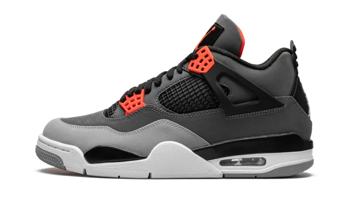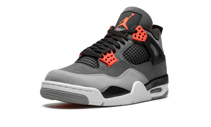 The Air Jordan 4 "Infrared" is a February 2021 release of the vintage basketball shoe in a colorway loosely inspired by the Chicago Bulls, Michael Jordan's former basketball team. The "Infrared" Jordan 4 also mimics the color block of the model's "Green Glow" colorway from 2013, trading the latter's green accents for Infrared. The shoe features a synthetic nubuck upper in light and dark grey. Black accenting can be found on the netting found on the tongue and mid-panel, on the "wings," and inner lining. Lighter shades of grey appear on the toe and outsole. A light grey Jumpman is located on the black heel counter and an Infrared Jumpman is printed on the black nylon tongue tag on the tongue. Additional Infrared detailing is found on the eyelets. Underfoot, a visible Air bubble in the white midsole completes the look. Release date: February 8, 2022