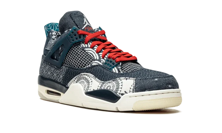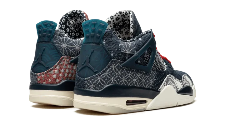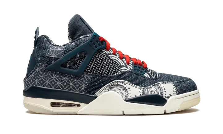 The Air Jordan 4 "Sashiko" features the traditional Japanese theme on Michael Jordan's fourth signature shoe. A December 2020 release, the "Sashiko" colorway marks the first instance of Jordan Brand using the theme following its appearance on the Nike SB Dunk Low and Nike Kyrie S2 Hybrid. The "Sashiko" displays the popular shishiko method of embroidery and stitching that is used to make old or used items "new again." Giving off a pre-worn vibe, the toe of the right shoe features a blue and red denim patchwork design. The rest of the overlay panels display the rugged jean material in a similar bespoke manner. Red shoelaces sit on top the mesh tongue of the right shoe and blue laces can be found on the left shoe. Moreover, Jordan Brand utilizes a split red and blue denim motif on the left tongue, and a light blue-on-dark-blue look for the left tongue. Standard Jumpman branding appears on the semi-translucent blue heel tab to finish off the look. Release date: December 5, 2020.
