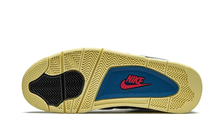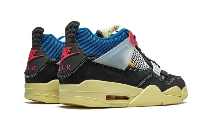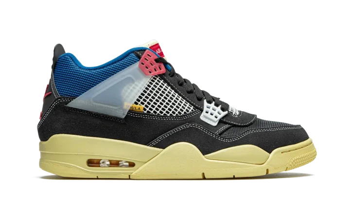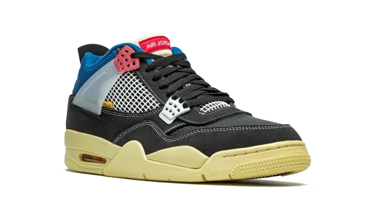The Union x Air Jordan 4 "Off Noir" is one of two desirable colorways produced exclusively for the Los Angeles boutique and Jordan Brand's Summer 2020 collaboration. The "Off Black" or "Off Noir" design of Union's Air Jordan 4 collection features a radically new and exciting color scheme that incorporates elements of vintage sportswear. A premium washed black plush suede appears on the mudguard, toe cap, and eyelets. Black and blue mesh detailing can be found on the toe and collar, respectively. Pink and grey plastic eyelet accents and a translucent lace support wing add to the unique appearance of the shoe. Additional style cues include white netting on the tongue and mid-panel, pink "Nike Air" on the black plastic heel cup, and a vintage inspired yellow sole. A shortened tongue measured to the specifications of Chris Gibbs, Union's owner, is folded over and stitched down. The wearer has the ability to remove the stitching to obtain a traditional Air Jordan 4 look. Release date: August 29. 2020.