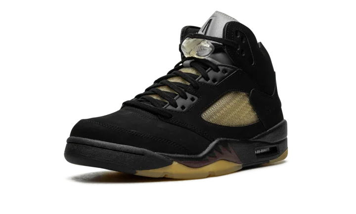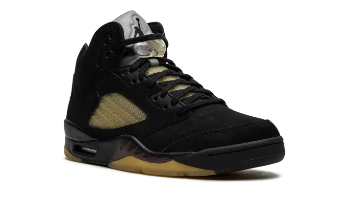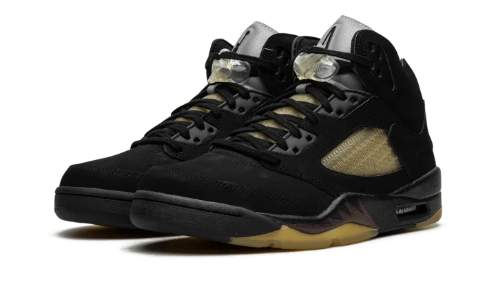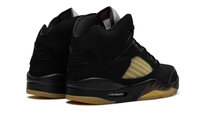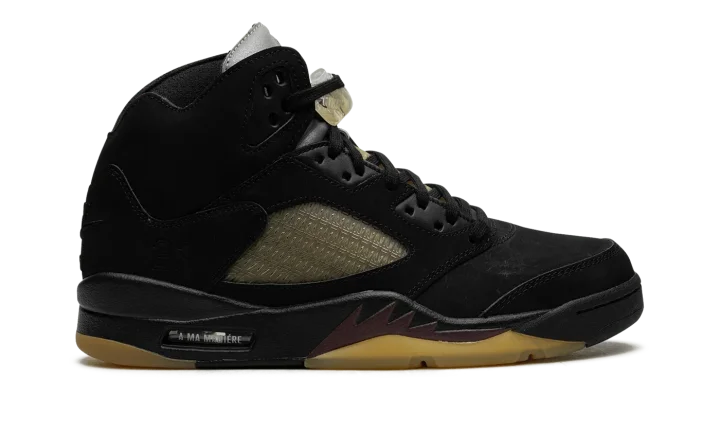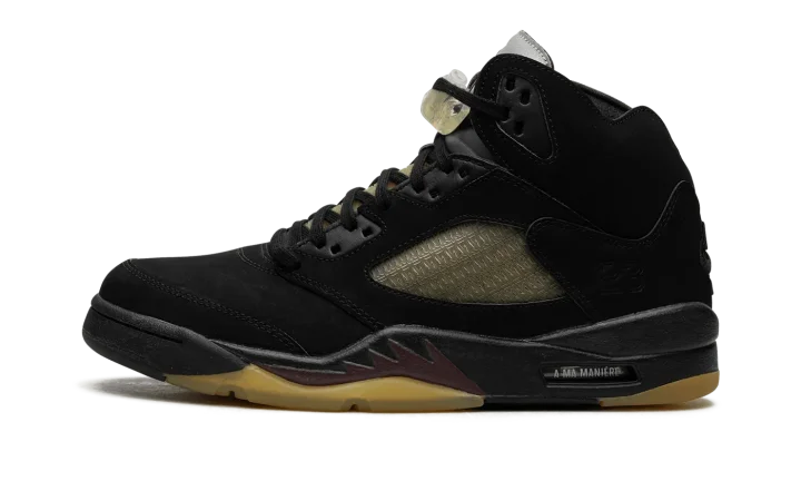 The A Ma Maniére x Air Jordan 5 SP "Black" is a collaboration by James Whitner's boutique on a colorway of Michael Jordan's fifth signature shoe with vintage details. Since the late 2010s, A Ma Maniére has been one of the most successful collaborators in the sneaker space, having worked with Jordan Brand on several now-classic Jordan sneakers on multiple occasions. As for the design of this shoe, the upper features a black nubuck construction with pre-aged netting on the tongue and mid-panel designed in an "A" pattern after A Ma Maniére's logo. The retailer's branding can also be found on the "A" logo on the silver reflective tongue of the left shoe while a black Jumpman is embroidered on the tongue of the right shoe. Classic "Nike Air" detailing is embroidered on the heel and Jordan's "23" jersey number is debossed on the lateral side of the heel. A yellow-tinted lace lock continues the shoe's vintage look, as does the pre-aged, semi-translucent outsole underneath the black midsole with maroon shark tooth detailing. Release date: November 22, 2023