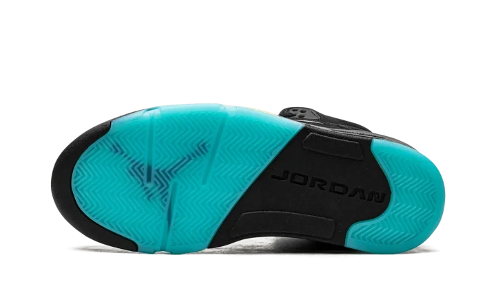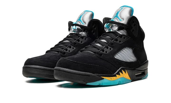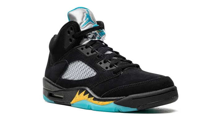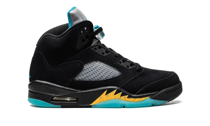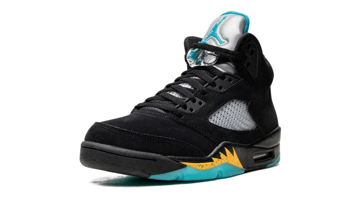 The Air Jordan 5 "Aqua" is a colorway of Michael Jordan's fifth signature shoe in a look loosely inspired by a Player Exclusive of the shoe for Chris Paul in his time with the New Orleans Hornets. The "Aqua" features a black synthetic nubuck construction with translucent netting on the sides and tongue. An Aqua-colored Jumpman is embroidered on the Metallic Silver reflective tongue and on the heel. Additional Aqua accenting can be found on the Jumpman on the lace toggle, on the inner lining, and on the shark tooth detailing on the midsole. The design replicates Paul's never released colorway of the shoe, sans his number "3" embroidered on each heel. Release date: April 8, 2023