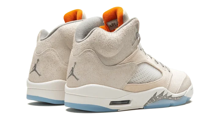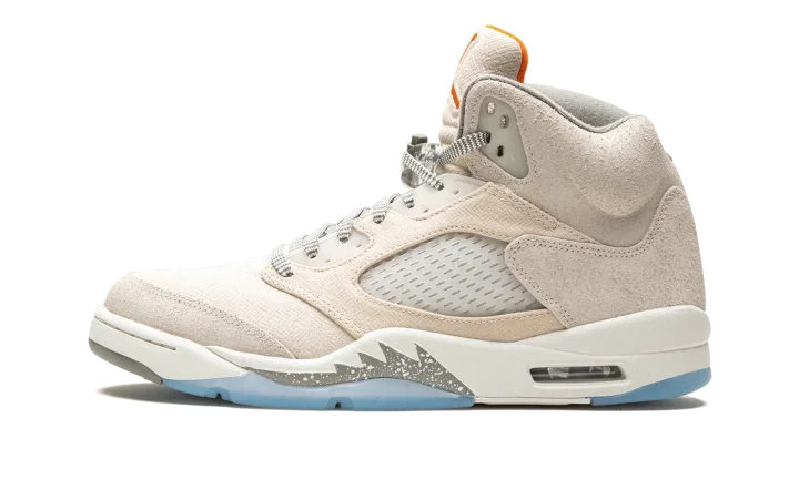 The Air Jordan 5 "Craft" is a modified version of the retro basketball shoe made from an interesting combination of materials that give it a lifestyle-focused design. Part of a greater collection of "Craft" sneakers, the Jordan 5 Craft features a Taupe-colored suede and textile construction with translucent netting on the mid-panel and tongue. An orange textile on the underside of the tongue matches the embroidered orange Jumpman on the tongue's front. Tonal Jumpman detailing is also found on the heel. Underfoot, grey shark tooth detailing with white speckling and an icy blue translucent outsole round out the premium look. Release date: June 17, 2023
