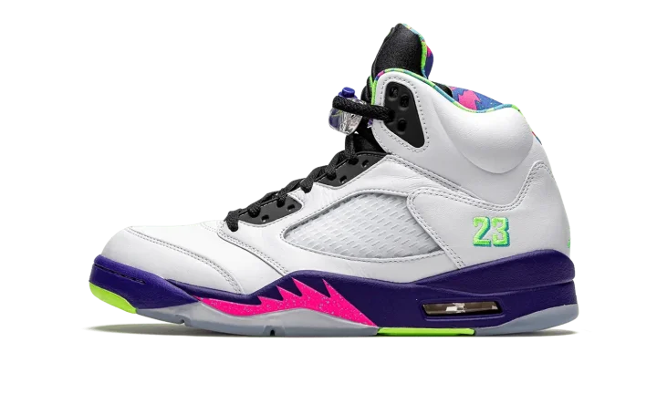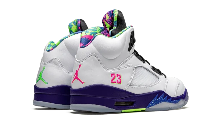 The Air Jordan 5 "Alternate Bel-Air" (also known as "Ghost Green") is reminiscent of the coveted "Bel-Air" colorway of Michael Jordan's fifth signature shoe. Both the original "Bel-Air" and "Alternate Bel-Air" are inspired by the "Grape" Jordan 5 worn by Will Smith on the "Fresh Prince of Bel-Air" in the '90s. The "Alternate Bel-Air" flips the decidedly throwback color scheme for a fresh new take. White leather appears on the upper, including the toe, collar, and heel. Vibrant contrasting Ghost Green and red "23" and Jumpman embroidery can be found on the heel of the left and right shoes, respectively. Translucent netting dots the mid-panel and tongue. Red Jumpman branding appears on the black neoprene tongue of the left pair, and Ghost Green Jumpman detailing appears on black tongue of the right shoe. Both pairs are finished off in purple midsoles with red shark tooth detailing on the forefoot and visible Air in the heel. Release date: August 15, 2020.
