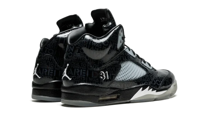 The Air Jordan 5 gets one of its most unique looks ever with this version from the 2013 Nike Doernbecher Freestyle Collection. The design was started by patient Isaac Arzate who was a patient at the hospital following a cardiac arrest, and was actually finished by his family after he suffered a second and fatal heart attack. With glow-in-the-dark detailing, the shoe also features Isaac's baseball number 9 on the left shoe and basketball number 31 on the right.
