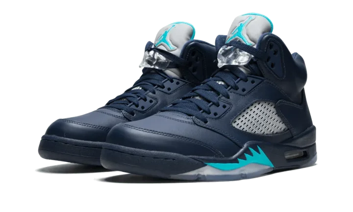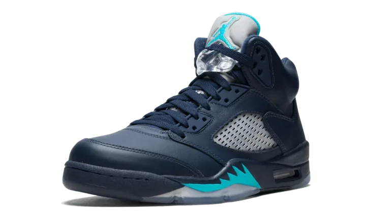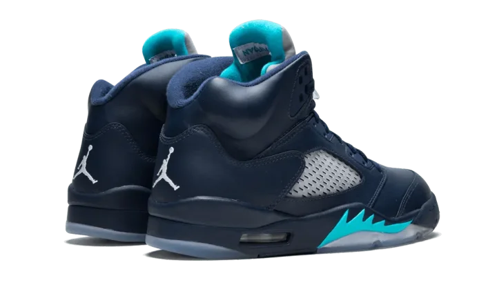 A 2015 release of the iconic Air Jordan 5, this Midnight Navy and Turquoise colorway of the shoe garnered the nickname "Hornets" due to its similar color scheme to Michael Jordan's Charlotte Hornets franchise. Despite the all-new colorway, one signature element to the Air Jordan 5 remains: a reflective silver tongue.
