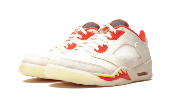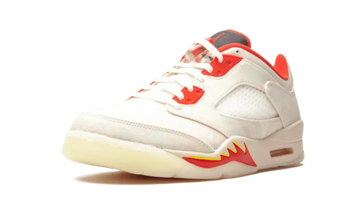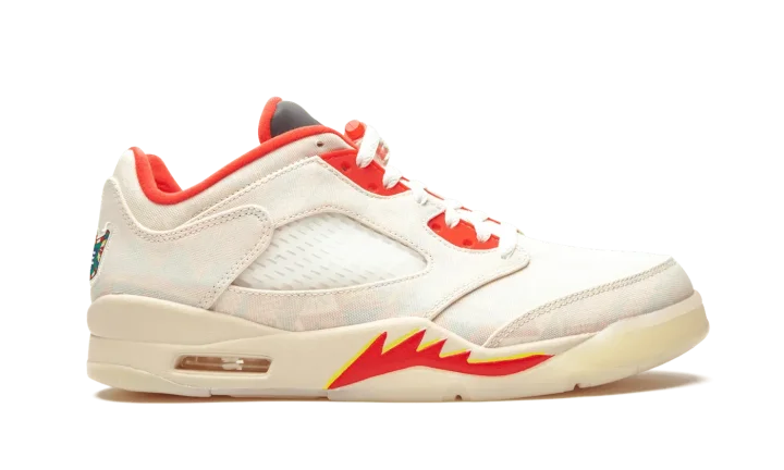 The Air Jordan 5 Low "Chinese New Year 2021" is a special makeup of Michael Jordan's fifth signature shoe for the traditional holiday. Released by Jordan Brand in January 2021, the "Chinese New Year" colorway appears on the Air Jordan 5 Low for the first time and, as you can see, the results are consistent with all of the great "Chinese New Years" designs created by Nike in years past. When worn away, the Sail canvas upper reveals a hidden colorway for a completely new vibe. Blazing Chile Red accents can be found on the upper and lower eyelet panels as well as on the sock liner and on the Jumpman embroidery on the black reflective tongue. The phrase "ACTION" can be seen layered beneath the translucent white netting on the medial side of the shoe—the lateral side displays the traditional Jordan 5 look. On the back, Jordan Brand places Chinese New Year-specific embroidery in place of Jumpman branding. A small clear Air window in the heel of the vintage inspired cream midsole finishes off the look. Release date: January 23, 2021.