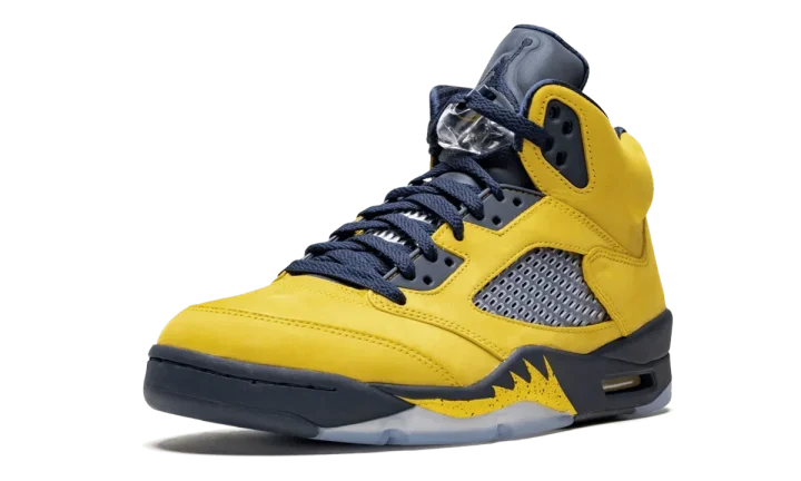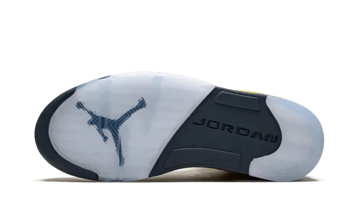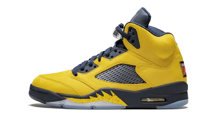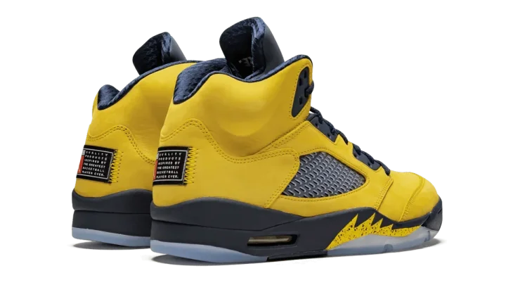 The Air Jordan 5 "Michigan" also known as the "Inspire" colorway is a vibrant look for the iconic silhouette that takes inspiration from the University of Michigan. Reminiscent of player exclusive colorways of Air Jordans designed just for the Michigan Wolverines basketball team, who are one of the top college programs sponsored by Jordan Brand, this Jordan 5 features a maize yellow nubuck upper with navy blue accents throughout, including for the reflective tongue. The heel is updated with a Team Jordan patch stitched on each shoe, while the model's signature icy clear outsole finishes the striking look. The Air Jordan 5 "Michigan" released on July 6, 2019.