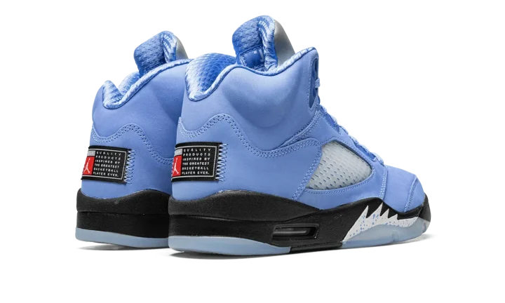 The Air Jordan 5 "UNC" is a colorway of the retro basketball shoe in a colorway inspired by Michael Jordan's alma mater, the University of North Carolina. The "UNC" Jordan 5 is not affiliated with the UNC Tar Heels, but nonetheless draws inspiration from the school and its college basketball team. The upper is designed in a University Blue nubuck construction with translucent netting on the tongue and mid-panel. A Jumpman is embroidered on the reflective Metallic Silver tongue. The heel is updated with a Team Jordan patch stitched on each shoe, while the model's signature icy clear outsole is paired with a black midsole that features silver shark tooth detailing. Release date: March 4, 2023