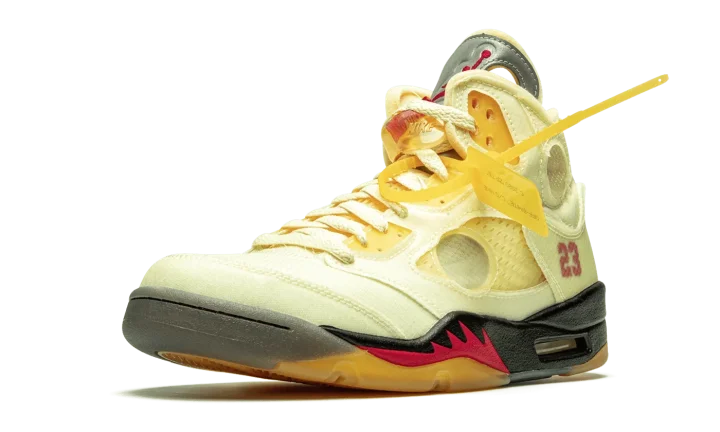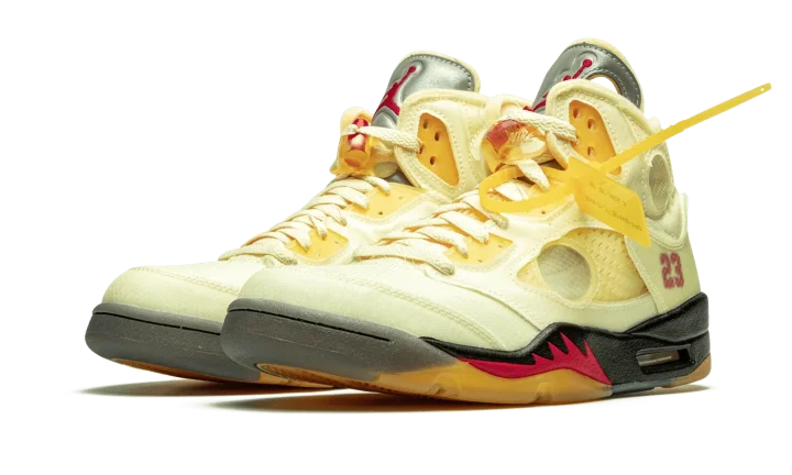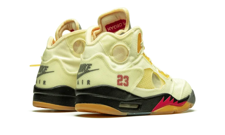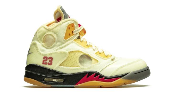 The Off-White x Air Jordan 5 "Sail" is the follow-up to Virgil Abloh's initial Jordan 5 collaboration from early 2020. Images of the "Sail" colorway surfaced around the same time Off-White and Jordan Brand released the black-based Jordan 5 in February 2020. Like the black version, this design features Abloh's singular deconstructed aesthetic. The upper displays exposed foam, mesh detailing, and a transparent film with die-cut circles placed randomly on the body and tongue in reference to the Jordan 2010. Off-White's signature industrial inspired styling is applied throughout, including the Helvetica text on the laces and medial side. Both the embroidered Jumpman on the silver reflective tongue and "23" branding on the heel are finished off in Fire Red as a call back to the original styling of Michael Jordan's "Player Exclusive" version. Additional nostalgic elements like the "Nike Air" on the heel and pre-yellowed outsole give the shoe a vintage look. Release date: October 24, 2020.