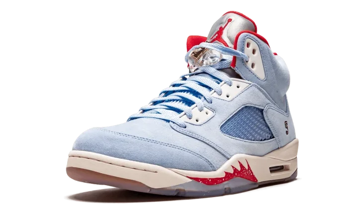The Trophy Room x Air Jordan 5 "Ice Blue" is a limited edition colorway of the iconic silhouette by the boutique owned by Michael Jordan's son, Marcus. The unique colorway is inspired by Michael Jordan's trophy room, which was an important part of the Jordan family house that Marcus grew up in. The Jordan 5 features an Ice Blue suede upper with red and Sail accents across the upper and midsole. Hits of metallic gold appear on the lace lock and on the "5" and "23" numerals embroidered on each heel. A traditional reflective silver tongue and Trophy Room and Jumpman logos on opposite heels complete the upper. The full-length clear rubber outsole reveals a wood floor graphic beneath it, a reference to the basketball court-style floor of Jordan's trophy room. For one final special detail, each pair also features cork insoles. The Trophy Room x Air Jordan 5 "Ice Blue" was limited to only 7,000 individually-numbered pairs, and released on May 18, 2019.
