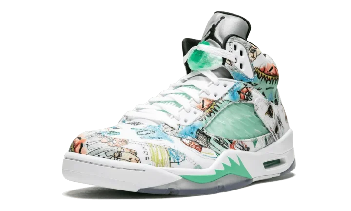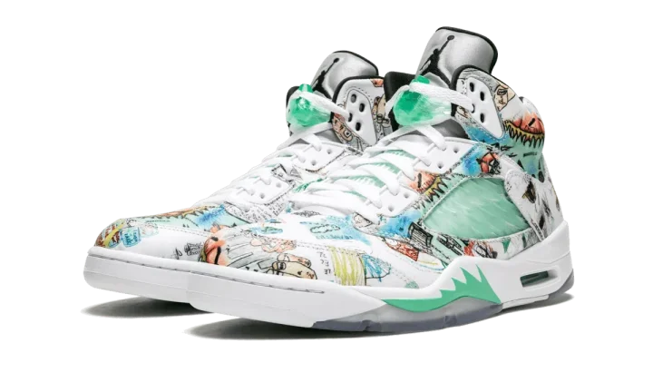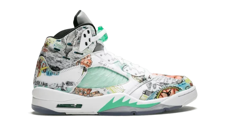 The Air Jordan 5 "Wings" is a special edition of the legendary silhouette featuring a graphic upper inspired by illustrations done by students at Little Black Pearl, which is a nonprofit cultural arts center serving Chicago's youth. The special details of the attention-garnering Air Jordan 5 don't stop at the all-over graphic print. The Jordan 5's signature details are also modified, with the lace toggle and mesh side panels altered into wing shapes. Both "winged" details also glow in the dark, while the model's traditional reflective tongue adds the final bit of flash. The Air Jordan 5 "Wings" promotes Jordan Brand's Wings program which helps youth around the world unlock their full potential through education.