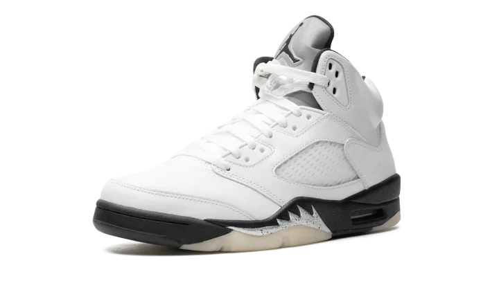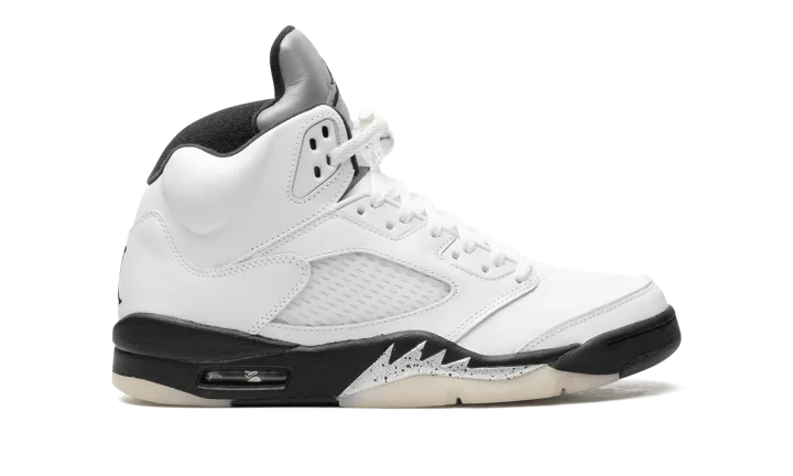 The Air Jordan 5 "White/Black" is a monochrome iteration of the classic Air Jordan silhouette that originally came out in 1990. The iconic design elements of the Jordan 5 such as the metallic tongue, lace toggle, translucent outsole, and fighter plane-inspired elements on the midsole, look incredibly sleek and clean in this "White/Black" colorway.