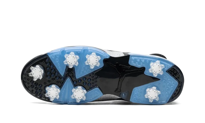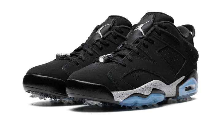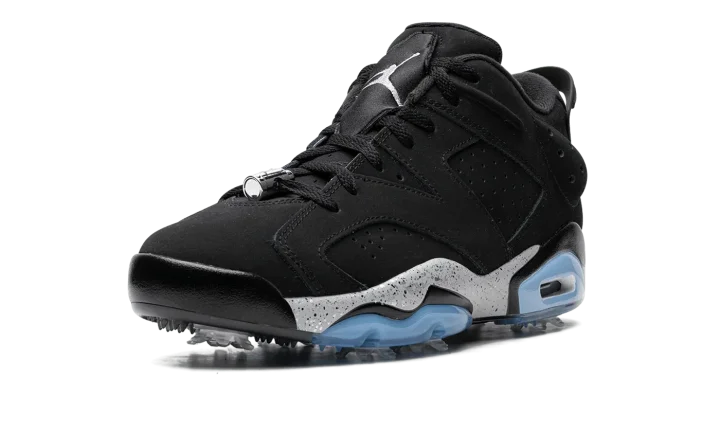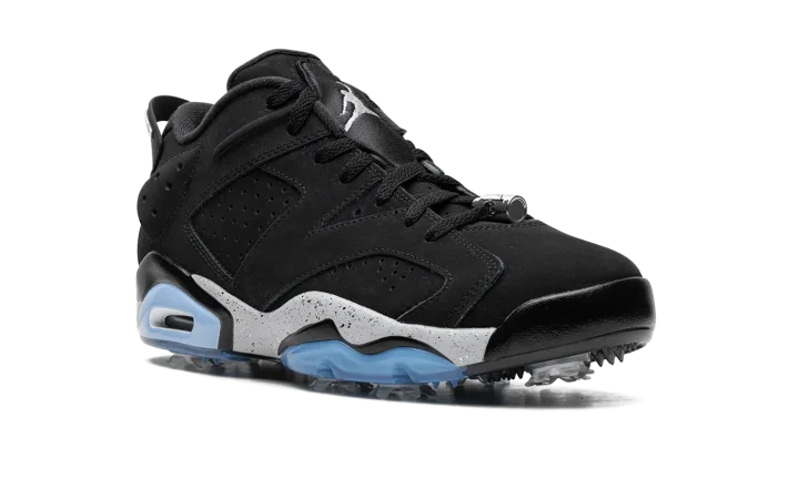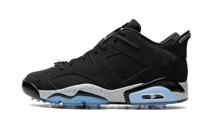 The Air Jordan 6 Low Golf "Metallic Silver" is an alternate version of the retro basketball shoe made for the golf course. The "Metallic Silver" Jordan 6 Low Golf is designed similarly to the Jordan 6 Low "Metallic Silver" from 2015, except for a few differences in the design of the midsole. The shoe features a black synthetic nubuck construction with tonal overlays. A Metallic Silver Jumpman is embroidered on the tongue and on the heel. Additional Metallic Silver or chrome detailing is found on the spoiler on the heel. The midsole is painted grey with black speckling. An icy translucent blue rubber outsole with nubs help provide traction on the golf course. Release date: May 17, 2023