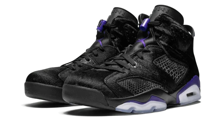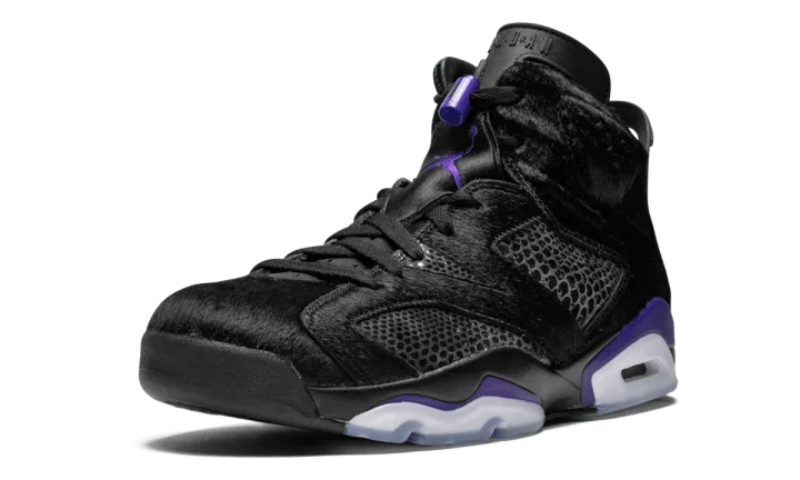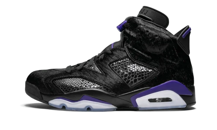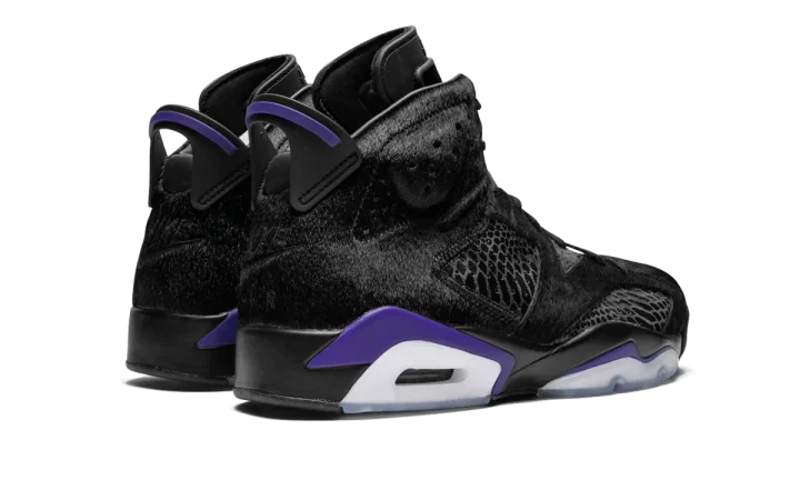 The Social Status x Air Jordan 6 "Black Cat" is a special edition of the iconic shoe in a luxe construction inspired by Michael Jordan's "Black Cat" nickname. The premium look was designed by North Carolina sneaker boutique Social Status and released during the 2019 NBA All-Star Weekend festivities in Charlotte. The Jordan 6 features a black faux fur upper with snakeskin texture on select panels as well as a premium leather lining. Purple accents are added for a nod to the Charlotte Hornets team colors. The design is appropriately finished with the traditional clear portions of the outsole and the original "Nike Air" branding embroidered on each heel. The Social Status x Air Jordan 6 "Black Cat" released on February 21, 2019.