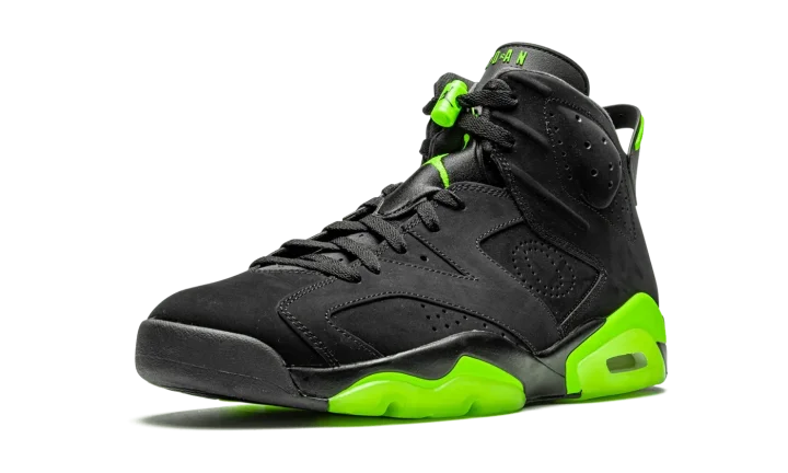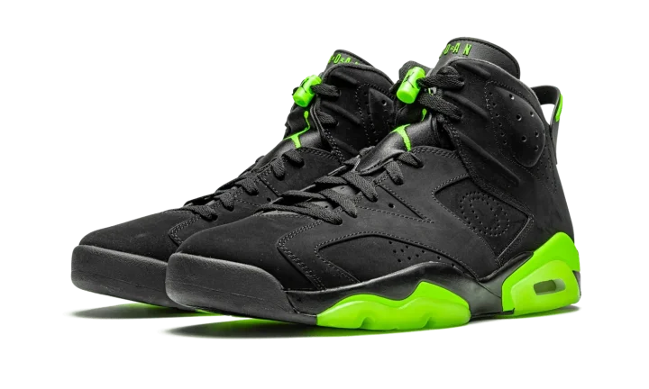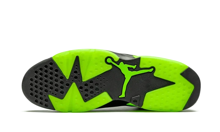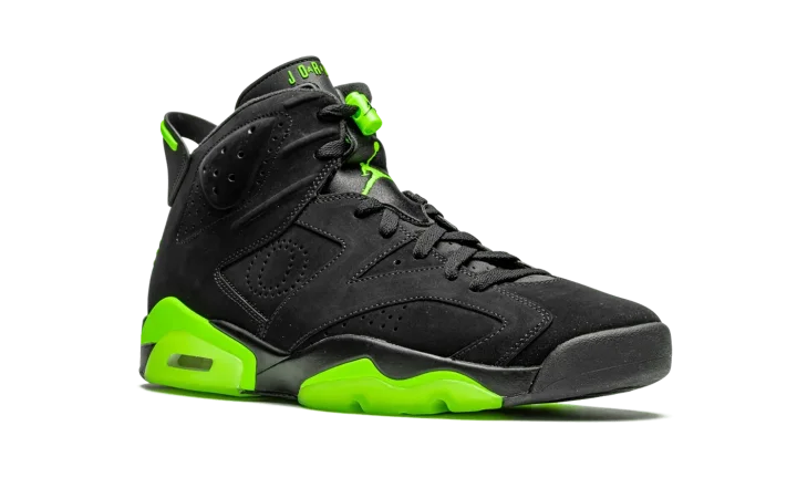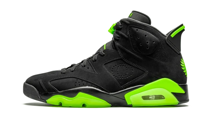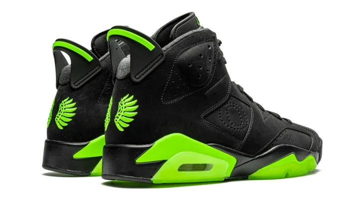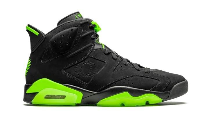 The Air Jordan 6 "Oregon Ducks PE" is a highly desirable, limited edition colorway given to student athletes on the Oregon Ducks sports teams. Unreleased to the general public, this Jordan 6 "Oregon Ducks PE" is one of several imaginative Air Jordans created exclusively for the Oregon Ducks. The upper features a black nubuck construction. Tonal overlays can be found on the forefoot, mid-panel, and heel. Contrasting neon green accents dot the Jumpman on the black nylon tongue, the lace lock, spoiler, and "Air Jordan" branding on the tongue. Additionally, specially perforated "O" logos can be found on either side and the Ducks' "Wings" logo is embroidered on the heel.