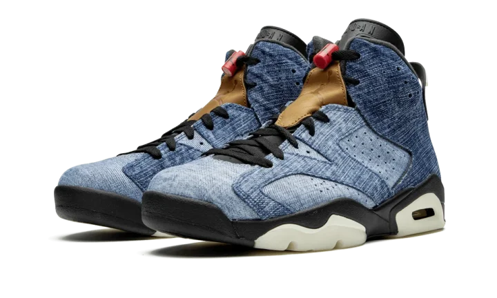 The Air Jordan 6 "Washed Denim" is a lifestyle remake of the early '90s performance basketball icon that was worn by Michael Jordan when he captured his first NBA Championship. The "Washed Denim" colorway is part of Jordan Brand's continued efforts of pushing their core classics towards a modern lifestyle aesthetic. A medium wash blue denim material covers the entire upper and is contrasted by a light wash denim base on the mid-panel and toe. Jordan Brand opts for a black nylon tongue that features a "natural" leather lace cover that mirrors a patch that you would find on the back of a pair of jeans. A black mudguard and cream-colored midsole with visible Air in the heel completes the look. Release date: December 28, 2019.