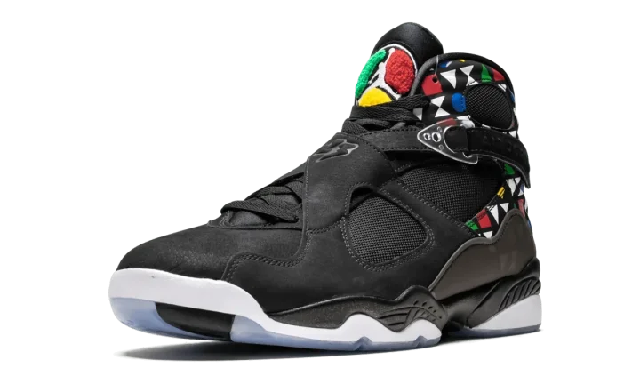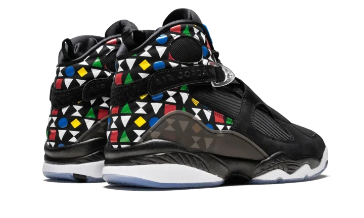 The Air Jordan 8 "Quai 54" is a special edition of the classic Michael Jordan signature shoe that released for the 2019 Quai 54 streetball tournament. Jordan Brand has made producing special releases for the annual hoops tournament in Paris, France a tradition in recent years, and 2019's set was one of the most unique and colorful yet. The collection was highlighted by this Jordan 8 featuring a multicolor geometric print, which was utilized across the set of sneakers and apparel for Quai 54. The construction features a ballistic nylon and nubuck upper in solid black with the colorful print on the heel and ankle paneling. Additional special details include clear buckles on the straps, and a translucent black plastic mudguard. Icy clear rubber and another hit of the pattern on the outsole complete the design. The Air Jordan 8 "Quai 54" released in limited quantities on June 8, 2019.