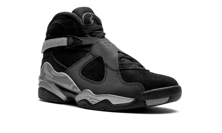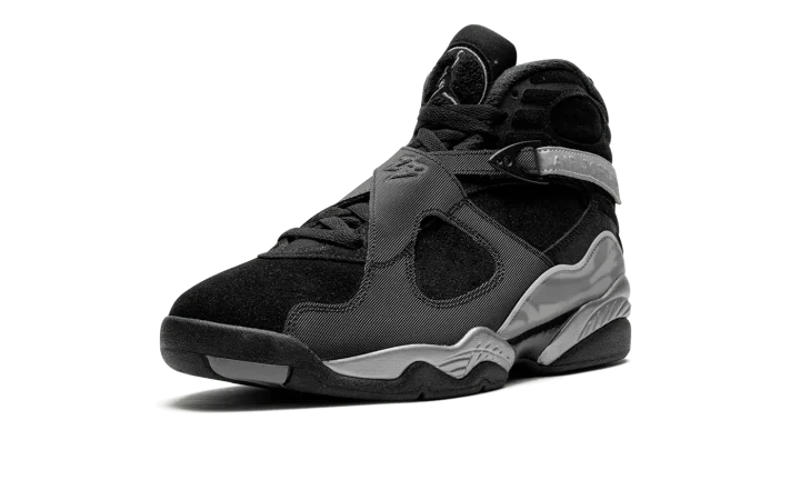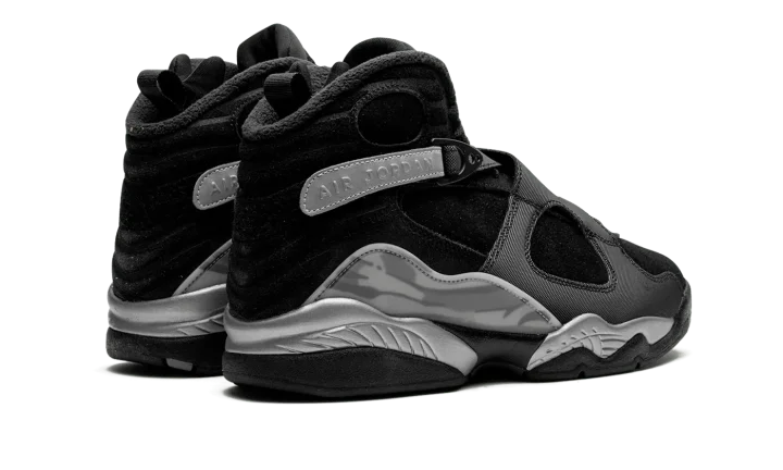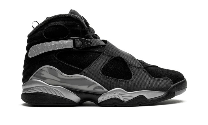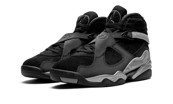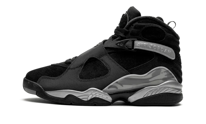 The Air Jordan 8 Winterized "Gunsmoke" is a version of the retro basketball shoe designed to withstand harsh weather conditions. Made to hold up against cold weather, the "Gunsmoke" Jordan 8 Winterized has a water-resistant suede and synthetic construction in black, Gunsmoke, and Metallic Silver. The Jordan 8's signature cross-straps are treated with a reflective finish on the rear portion with "Air Jordan" branding seen on the sides. A chenille Jumpman patch appears on the tongue. The Jordan 8's signature abstract graphic detailing is found on the mudguard in a cream and grey pattern. Release date: November 27, 2023