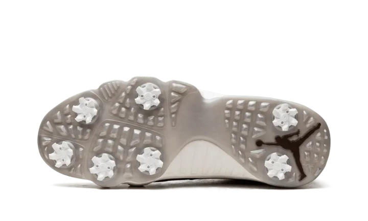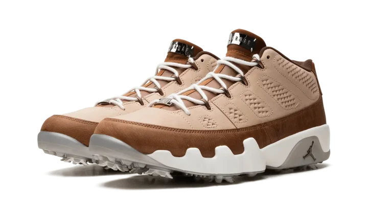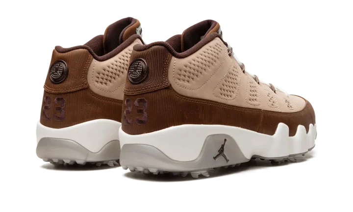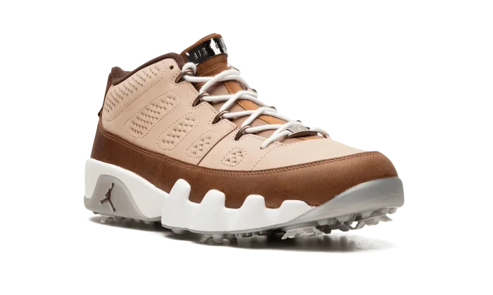 The Air Jordan 9 Low Golf "Masters" is a colorway of the golf version of the retro basketball shoe that nods to the storied golf championship tournament. The Jordan 9 Golf features modifications for the fairway, including rubber spikes on the outsole that provide traction. The "Masters" colorway honors the prestigious PGA "Masters" tournament with a light tan suede base and a dark brown leather mudguard with a woodgrain textured finish. A metallic "Jordan" nameplate appears on the tongue, adding to the shoe's luxury appeal. Underfoot, spikes on the outsole provide traction on the golf course. Release date: April 2024