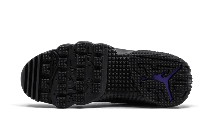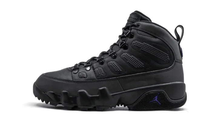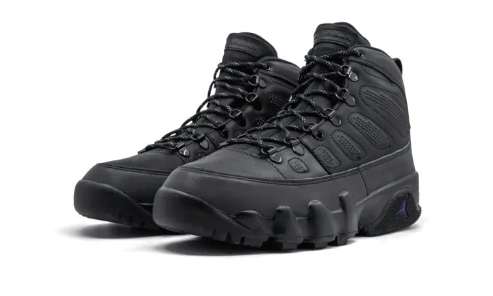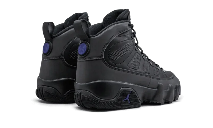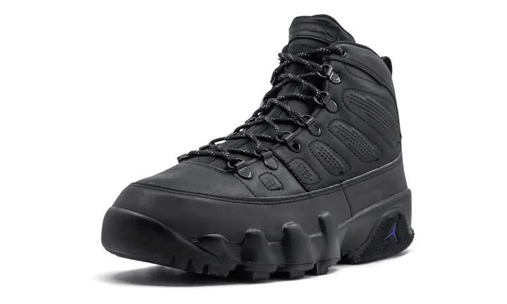 The Air Jordan 9 Boot is a stylish winterized interpretation of the classic silhouette. Designed to protect your feet in harsh weather, the iconic Air Jordan style gets beefed up for fall and winter wear. Done in all-over black, the rugged design features a nubuck leather upper with a water-resistant coating and gusseted tongue. A tough rubber outsole adds extra traction. The Air Jordan 9 Boot has a hint of blue on the sole and heel logos and comes complete with metal D-ring lace eyelets to further accentuate the "sneakerboot" motif.