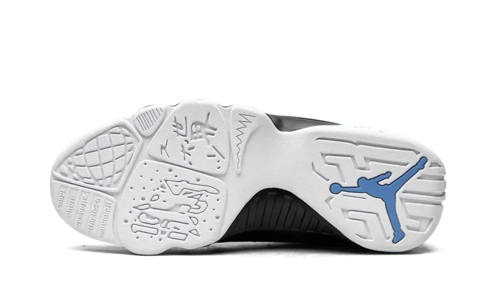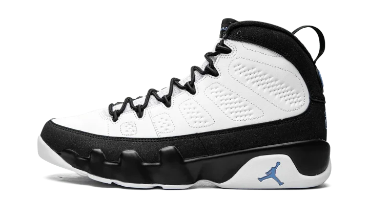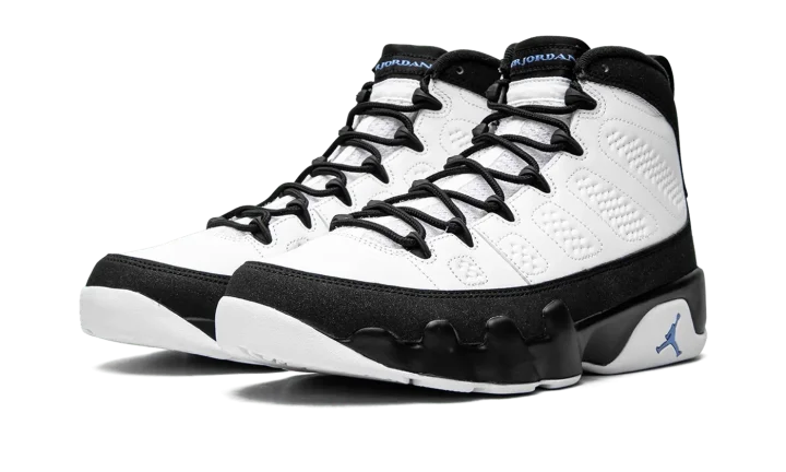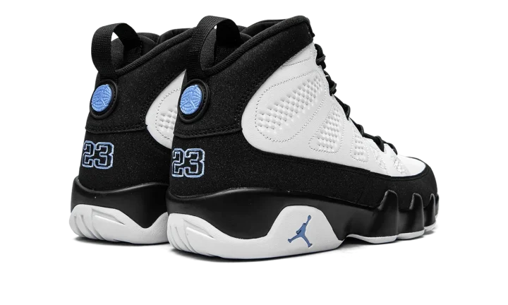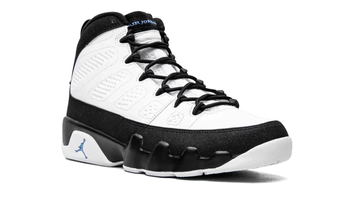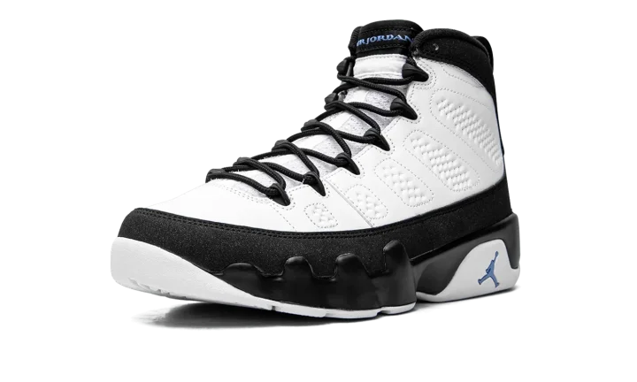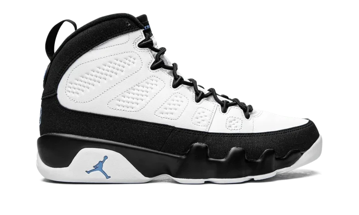 The Air Jordan 9 "University Blue" is a clean look for Michael Jordan's ninth signature shoe that draws comparisons to the original "UNC" or "Powder Blue" colorway from 1994. Collectors may recall "His Airness" suiting up in his old UNC Tarheels team uniform while wearing the OG "Powder Blue" Jordan 9 for Nike advertisements during his brief hiatus from the NBA in the mid '90s, and the "University Blue" design pays homage to the "UNC" theme with subtle accents. The upper features a white leather construction with a "diamond" motif appearing along the medial and lateral sides of the shoe. A speckled black synthetic nubuck mudguard above the black painted midsole breaks up the look. Elsewhere, black rubber eyelets and rope laces contrast the white mesh tongue. Branding appears on the form of University Blue "23" embroidery on the heel and "Air Jordan" on the tongue. Additional "UNC" inspired accenting can be found on the mini Jumpman emblem on the sole and on the "globe" insignia on the heel. A black nylon pull tab on the heel and inner bootie lining complete the look of the Jordan 9 "University Blue." Release date: December 5, 2020.