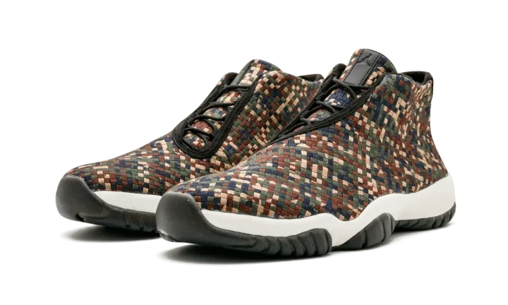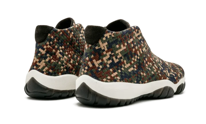 The Jordan Future lifestyle sneaker receives a premium woven upper in a color palette of traditional woodland camouflage, resulting in a unique take on the popular motif.