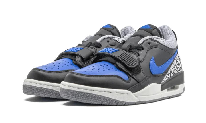 The Jordan Legacy 312 Low shoe design is derived from the expert mind of Don C, a longtime collaborator with Jordan Brand and Nike. Here, Don C combines signature elements of different Jordan models together for a fresh look. The upper consists of a black leather base with a royal blue perforated toe and black overlays on the forefoot, eyelets, and mudguard. A blue Swoosh sits on the mid-panel, while a black strap crosses the forefoot and provides lockdown support. Elephant print is located on the lateral panel as an ode to the timeless shoe, and a visible Air unit in the heel finishes the look.