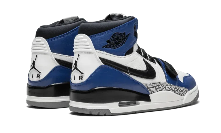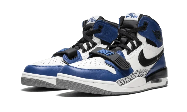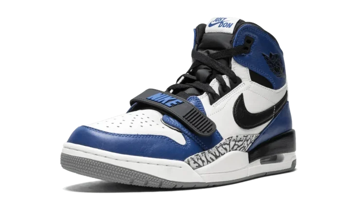 Combining elements of a few of his favorite retro basketball sneakers, Don C teamed up with Jordan Brand to create the Jordan Legacy 312 in 2018. The bold silhouette is primarily a mix of the Air Jordan 1 and Air Jordan 3, but Don C also incorporated some more more obscure Nike basketball sneakers into the formula. The midfoot elephant print paneling was inspired by the Air Force STS, and the midfoot strap comes from the Air Alpha Force Low. This Jordan Legacy 312 "Storm Blue" hints at the original "Royal" colorway of the Air Jordan 1, while also calling to mind the legendary Fragment x Air Jordan 1.