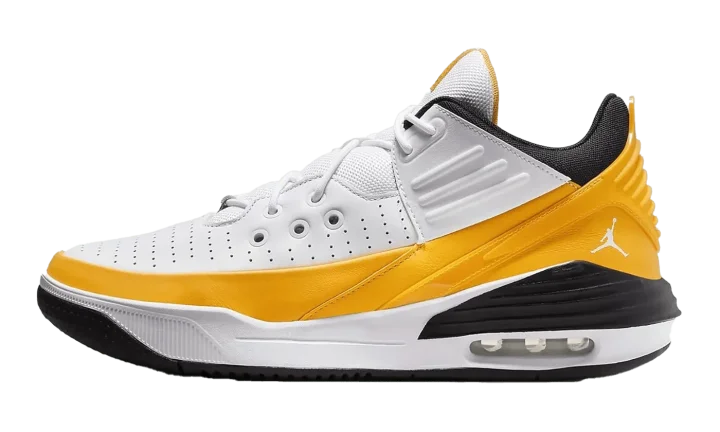 When you need a shoe ready 24/7, grab the Air Jordan Max Aura 5 'White/Yellow Ochre' sneaker. This stylish pair takes clear inspiration from the classic AJ3, giving a modern spin to an iconic design. The durable leather and textile upper features crisp white mixed with a vibrant pop of Yellow Ochre. With a supportive plastic heel, eyelet details nodding to the AJ3, and lightweight Nike Air-Sole units for all-day cushioning, this shoe is perfect for effortless street style and reliable traction.