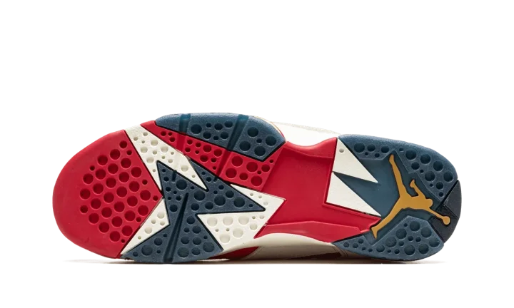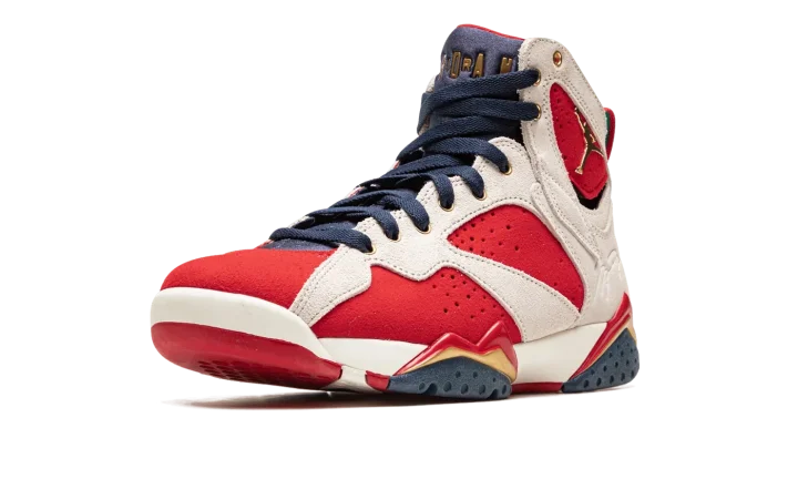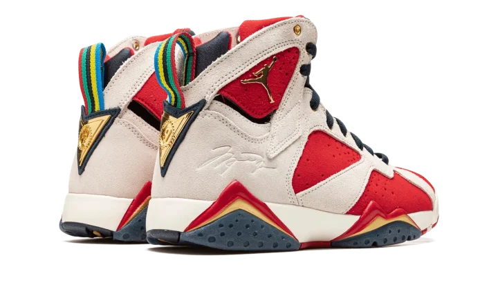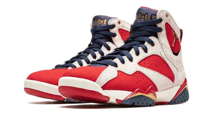 The Trophy Room x Air Jordan 7 "New Sheriff in Town" is a collaboration between Marcus Jordan's sneaker boutique and Jordan Brand on his father's seventh signature shoe. Dressed in a decidedly "USA" inspired look, the Jordan 7 "New Sheriff in Town" by Marcus Jordan and Trophy Room references the famous quote Michael had for Dream Team teammates Magic Johnson and Larry Bird during a Dream Team practice. It also riffs on the Jordan 7's "Olympic" colorway that was worn by Jordan on the '92 Dream Team. As for its design, the "New Sheriff in Town" features a True Red suede base with cream suede overlays. Michael Jordan's signature is debossed on the lateral side of the heel and a Metallic Gold Jumpman emblem appears on the collar. Additional gold accenting is found on the Gold Medal-inspired heel tabs. Release date: November 5, 2022