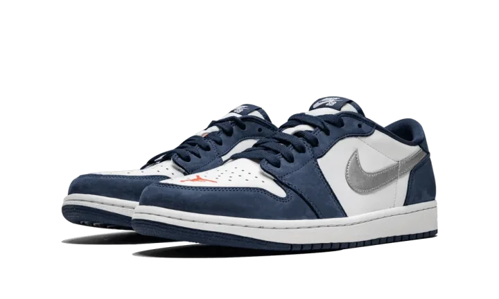 The Nike SB x Air Jordan 1 Low "Eric Koston" is a collaborative release of the low-top Jordan 1 by Nike's skateboarding division designed by longtime team rider Eric Koston. The skate legend and avid sneaker collector puts his own touch on the Jordan 1 Low, featuring a clean look in white leather and navy blue suede with metallic silver Swooshes. Koston adds a Jumpman logo to the toe box in red embroidery. Each pair also features the classic Jordan wings logo on the heel and a Nike SB logo on the tongue tag. The Nike SB x Air Jordan 1 Low "Eric Koston" released during the summer of 2019.
