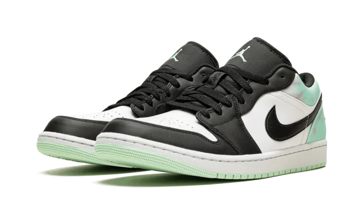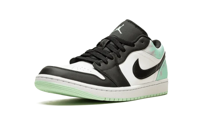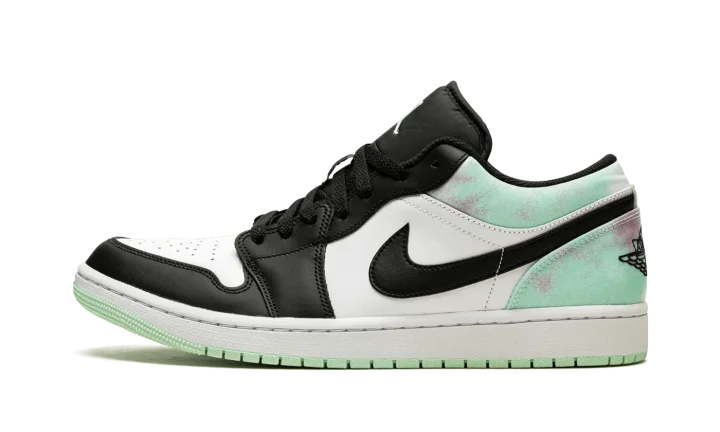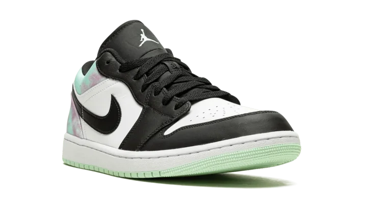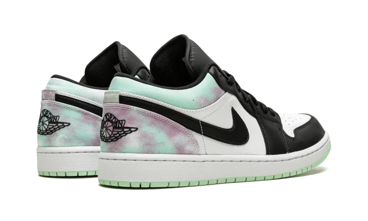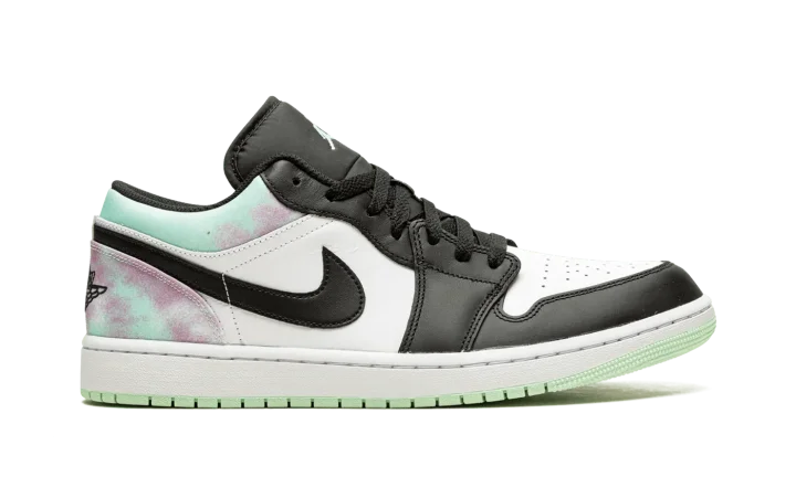 The Air Jordan 1 Low "Tie-Dye" is a fun, summer-ready colorway of the classic sihouette. This fresh sneaker features signature "Black Toe" AJ1 blocking with a white leather base, black leather overlay and pastel green and purple tie-dye hits on the collar and heel. A black Jordan Wings logo on the heel and a white Jumpman logo on the tongue bring it all together.
