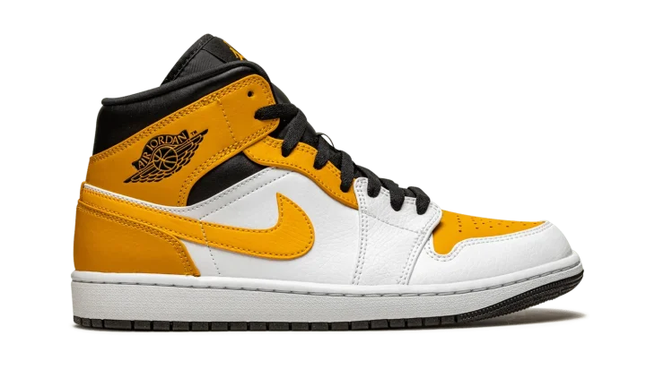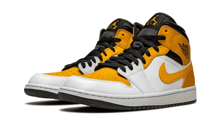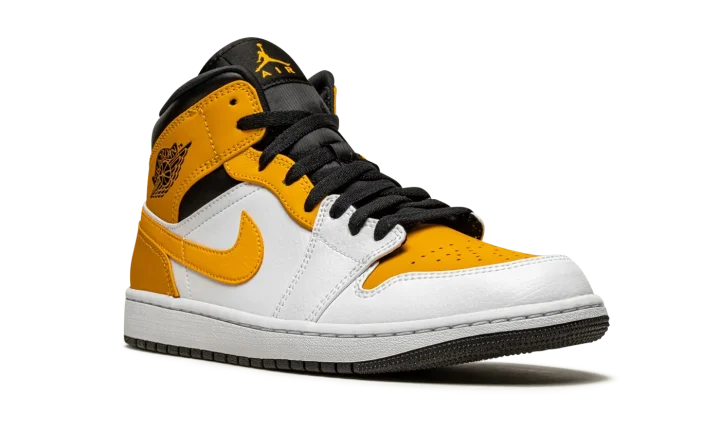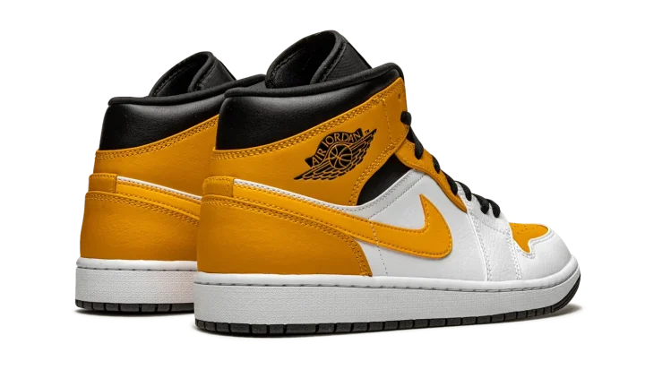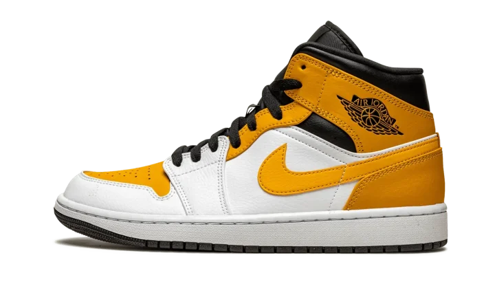 The Air Jordan 1 Mid "University Gold" is a summer-ready colorway of the amid-top version of Michael Jordan's first signature shoe. Appearing on the popular mid silhouette of the Jordan 1, the "University Gold" features warm University Gold leather detailing on the perforated toe, eyelets, mid-panel, collar, and heel. The same golden hue of leather appears on the Swoosh branding on both sides of the shoe and on the Jumpman insignia on the black nylon tongue tag. A black "Wings" logo can be found on the collar. A crisp cut of white tumbled leather appears on the forefoot, toe cap, and mid-panel. The white midsole is contrasted by a black outsole to round out the look of the Air Jordan 1 Mid "University Gold."
