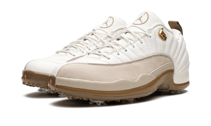 The Air Jordan 12 Golf "Driftwood" is an alternate version of the retro basketball shoe designed for the golf course. Jordan Brand's Jordan Golf collection debuted in 2022 before exploding in popularity in 2023 due to the success of releases such as the Air Jordan 1 Low Golf "Chicago," Air Jordan 4 Golf "Bred," and this Jordan 12 Golf in "Driftwood." Here, the colorway features a white leather upper with a Driftwood suede mudguard. Metallic Gold eyelets combine with the copper-colored Jumpman logo on the tongue to give the shoe a premium look. Underfoot, a cleated outsole provides traction on the fairway. Release date: June 15, 2023