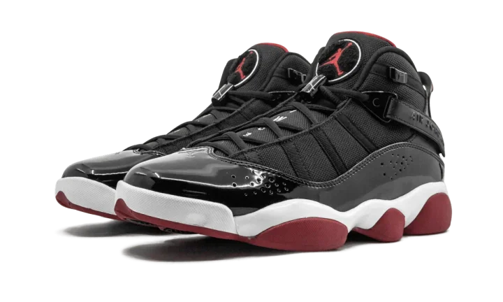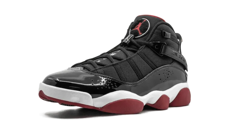 The Air Jordan 6 Rings "Bred" combines elements from each Air Jordan style Michael Jordan wore when he won his six NBA Championships. The all-black upper features a combination of ballistic mesh and shimmering patent leather taken from the Air Jordan 11, while the outsole of the Air Jordan 13 opts for a red tint to provide contrast. Other highlights include the tongue's fuzzy Jumpman patch and straps from the Air Jordan 8 and the heel tab from the Air Jordan 6.