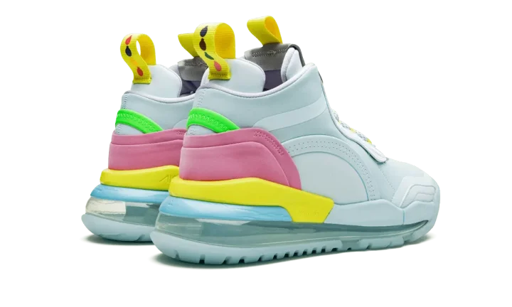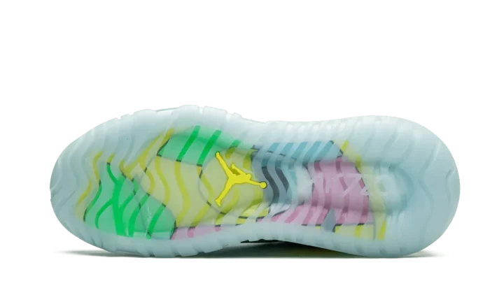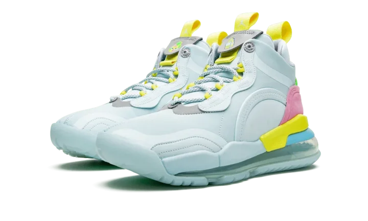 The Cole Bennett Lyrical Lemonade x Nike Jordan Aerospace 720 brings music video director and Lyrical Lemonade founder Cole Bennet's ideas to life on a footwear classic. With a design inspired by Bennett's motto "Global Now, Chicago Forever," the upper's icy blue tone represents the stripes on Chicago's flag while accents of purple, green, and yellow add a pop of color to the suede overlay and TPU molding found on the heel. Similar pastel shades also make an appearance on the different Lyrical Lemonade cartoon logos featured on each tongue. The translucent blue midsole includes signature Air cushioning and an insole that displays Lyrical Lemonade graphics.