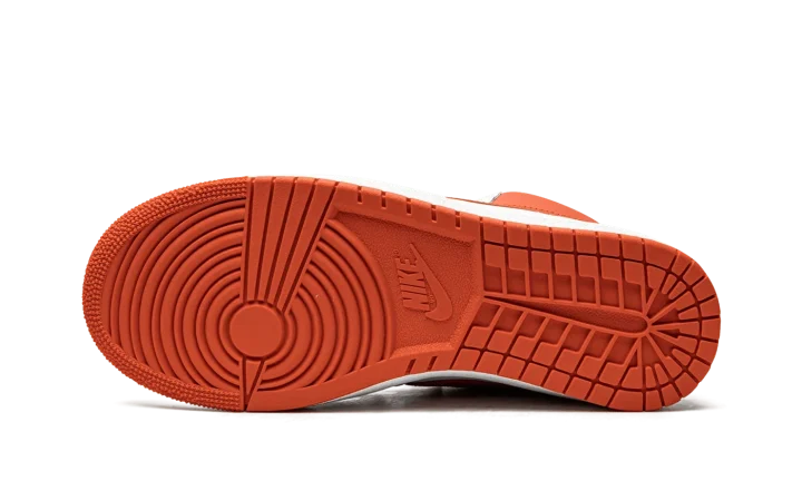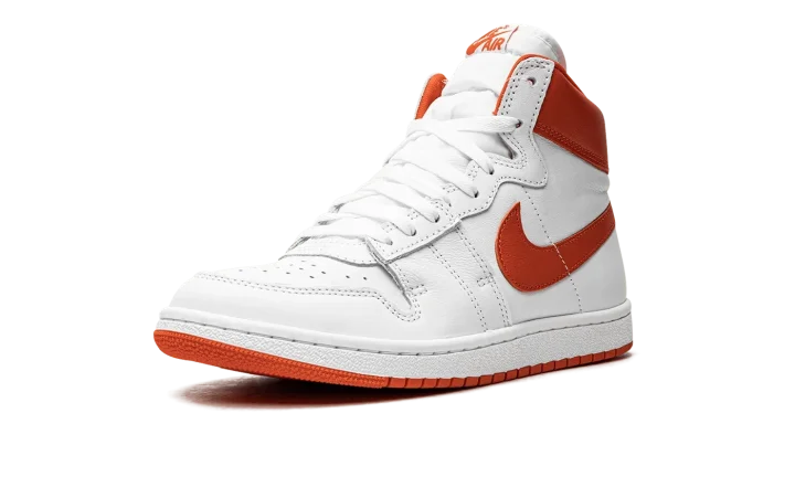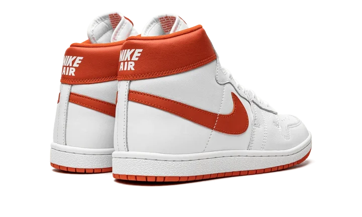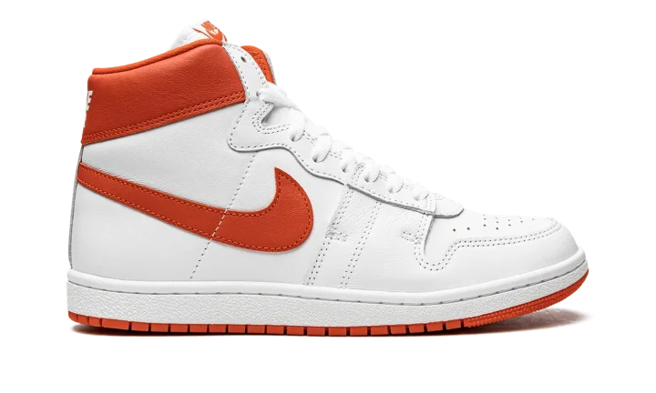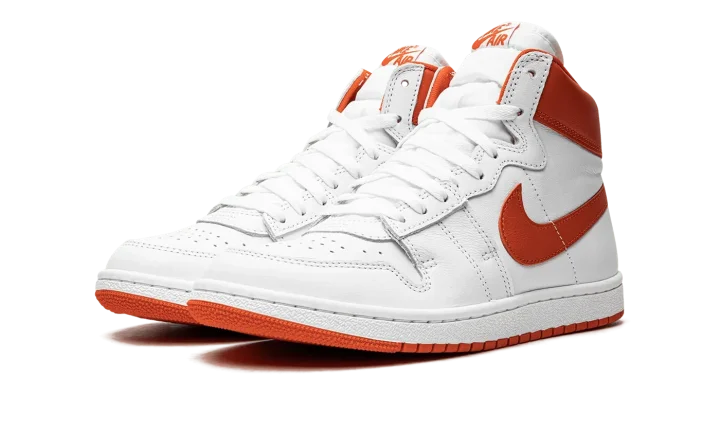 The Nike Air Ship "Team Orange" is a white-and-orange colorway of the retro basketball shoe that was worn by Michael Jordan early in his career with the Chicago Bulls. The Air Ship was originally released by Nike in 1984 and was worn by Jordan during his rookie NBA season before switching to the Air Jordan 1. The "Team Orange" colorway features a clean appearance with a white leather construction and Team Orange accents. Specifically, orange leather is found around the collar, on the leather Swoosh logo on the sides, and on the "Nike Air" and Swoosh branding on the tongue tag. Underfoot, a white midsole and Team Orange rubber outsole complete the look.