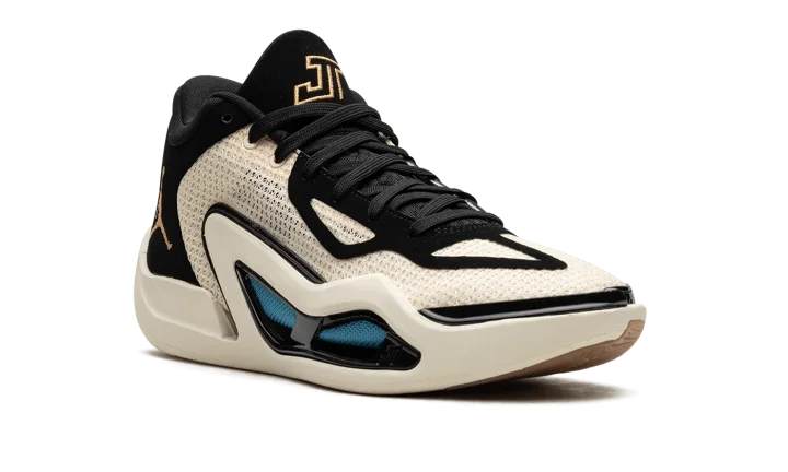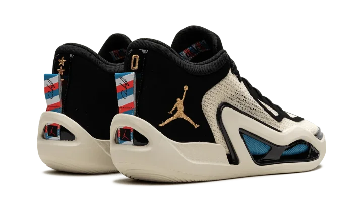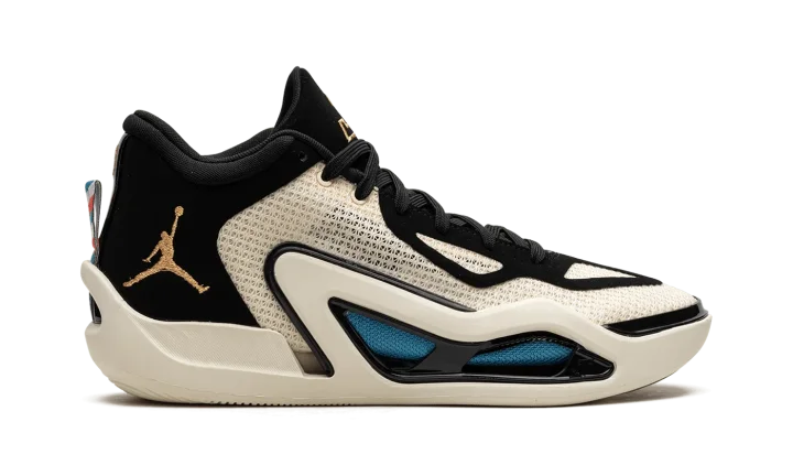 The Jordan Tatum 1 "Barbershop" is a colorway of Jayson Tatum's first signature shoe with Jordan Brand inspired by a memorable quote by Tatum from 2019: "When I get a cut, I think I'm Top 5." The "Barbershop" Tatum 1 features a cream white mesh construction with overlaying black synthetic nubuck panels. A Metallic Gold Jumpman is found on the side of the heel. The left shoe features red detailing on the midsole's mesh "windows," while the right shoe adds blue accents in the same areas. Additional gold accenting is found on the "JT" embroidery on the tongue. Striped detailing inspired by barber shop poles lands on the heel tab. Release date: May 12, 2023