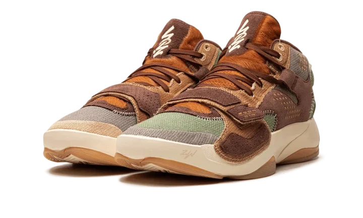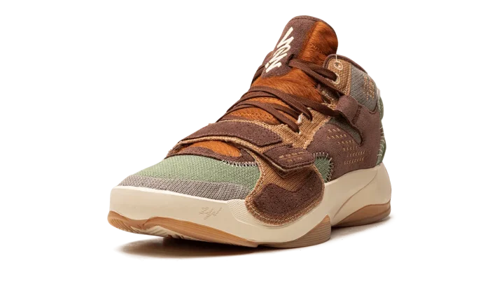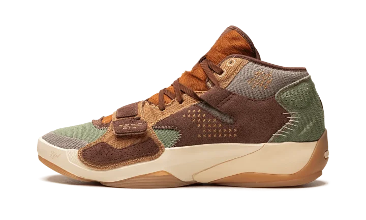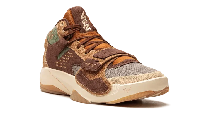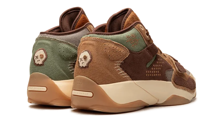 The Jordan Zion 2 "Voodoo" is a colorway of Zion Williamson's second signature shoe with Jordan Brand inspired by the city of New Orleans. Released alongside an Air Jordan 1 Low of the same nickname, the Zion 2 "Voodoo" is undoubtedly inspired by voodoo dolls, a fixture of New Orleans' lore. A mismatched color block is seen on the design. Specifically, olive green canvas is found on the toe, mid-panel, and heel of the left shoe while grey canvas is seen on the same areas on the right shoe. Burlap-like overlays are designed in a mismatched color block of green and brown on the heel of the left and right shoe, respectively. A voodoo doll-like character appears on the heel. Release date: June 22, 2022